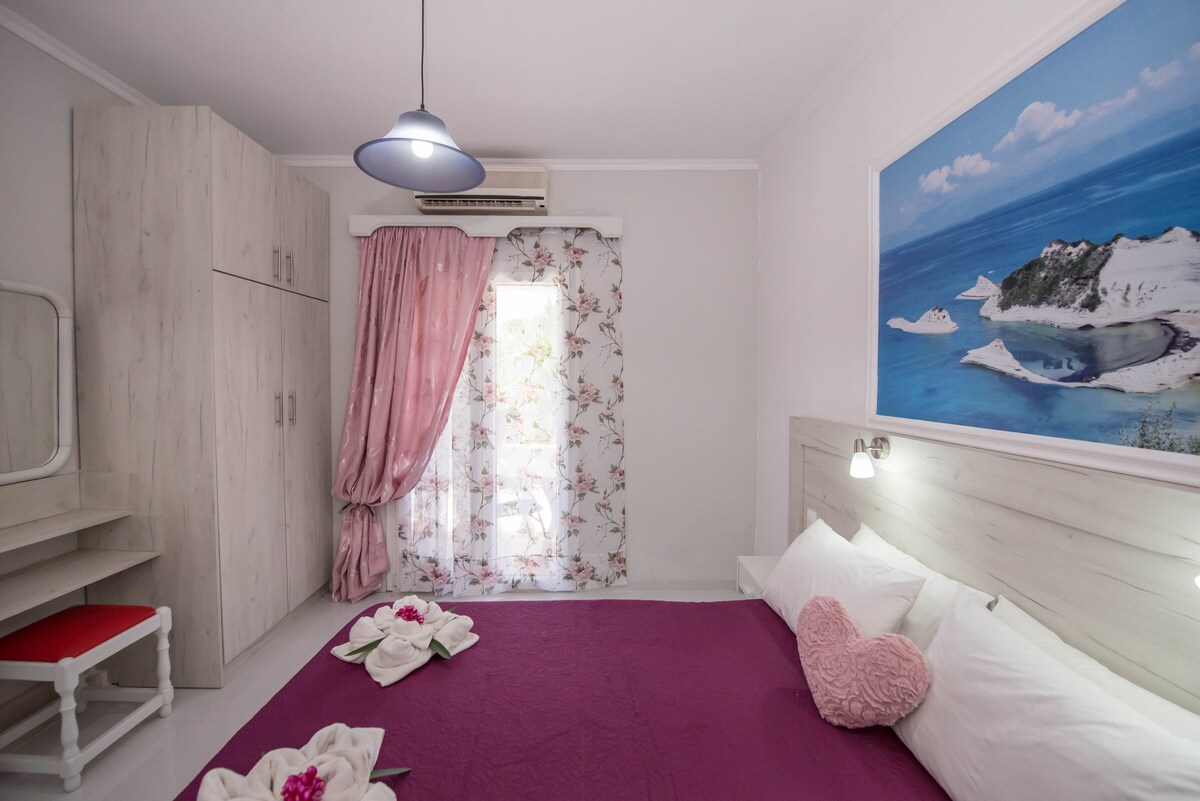 Nag-aalok kami ng maganda at kahanga-hangang apartment na may malaking POOL na matatagpuan sa Nissaki, Corfu sa hilagang-silangan na baybayin, na itinuturing na Corfiot Riviera. Napakaganda ng tanawin ng dagat sa balkonahe. Ang layo sa mga pagpipiliang restawran, supermarket, panaderya, snack bar, botika, pamilihan ng prutas, at ATM machine ay 250 metro. Magandang pagpipilian para sa mga bisitang naghahanap ng bakasyong walang sasakyan. May balkonahe ito na may magandang tanawin ng dagat. NAG - AALOK KAMI NG PAGLILIPAT MULA AT SA AIRPORT SA ISANG NAPAKA - COMPETITIVE NA PRESYO.