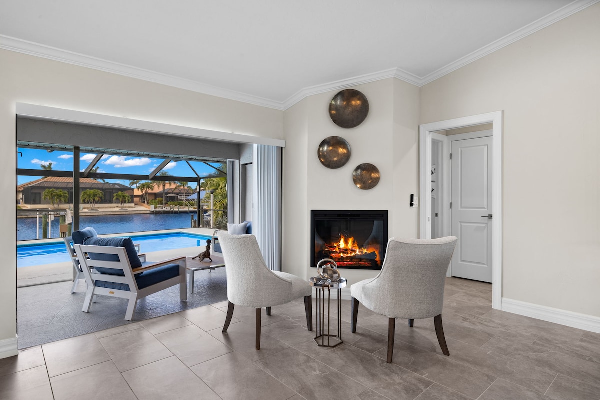 ONE OF THE BEST WATERFRONTS IN CAPE CORAL! A short walk to the beach a. This 2,500+sq ft home has stunning sunsets and South Western water views from all main living areas,as well as the Master Suite. Heated pool w/ LED colored lighting, built in Spa,Pool bath, full laundry facility, Lanai,Fireplace ,Wi-fi and TVs in every bedroom, private dock . Boat on lift for rent w/RPM rentals . Large 2-car garage w/5 bicycles,beach wagon & cooler on site.