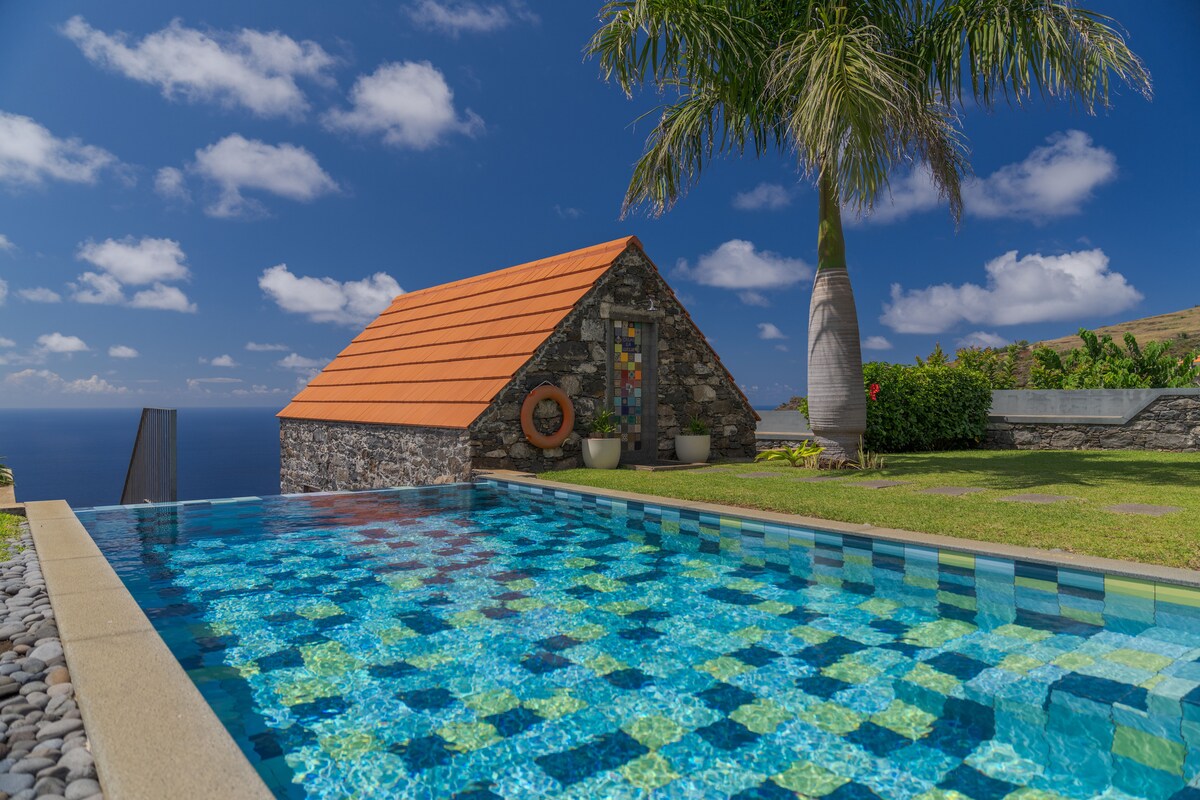 Perpektong romantikong tuluyan na may mga nakakamanghang tanawin para makapagpahinga at makapagpahinga. Matatagpuan sa magagandang bundok ng Calheta, perpekto ang tahimik na paraiso na ito para sa pinalamig at Romantikong bakasyon na iyon. Malapit sa 2 Levadas at waterfalls, para sa isang leasurely walk sa kalikasan. 10 minuto ang layo ng Sandy Beach. Magandang tanawin ng Karagatang Atlantiko at mga bundok. NGAYON AY MAY PLUNGE POOL NA MAY HYDROMASSAGE AT DALAWANG NILAGYAN NA PATYO. Malapit ang mga supermarket/Restawran.