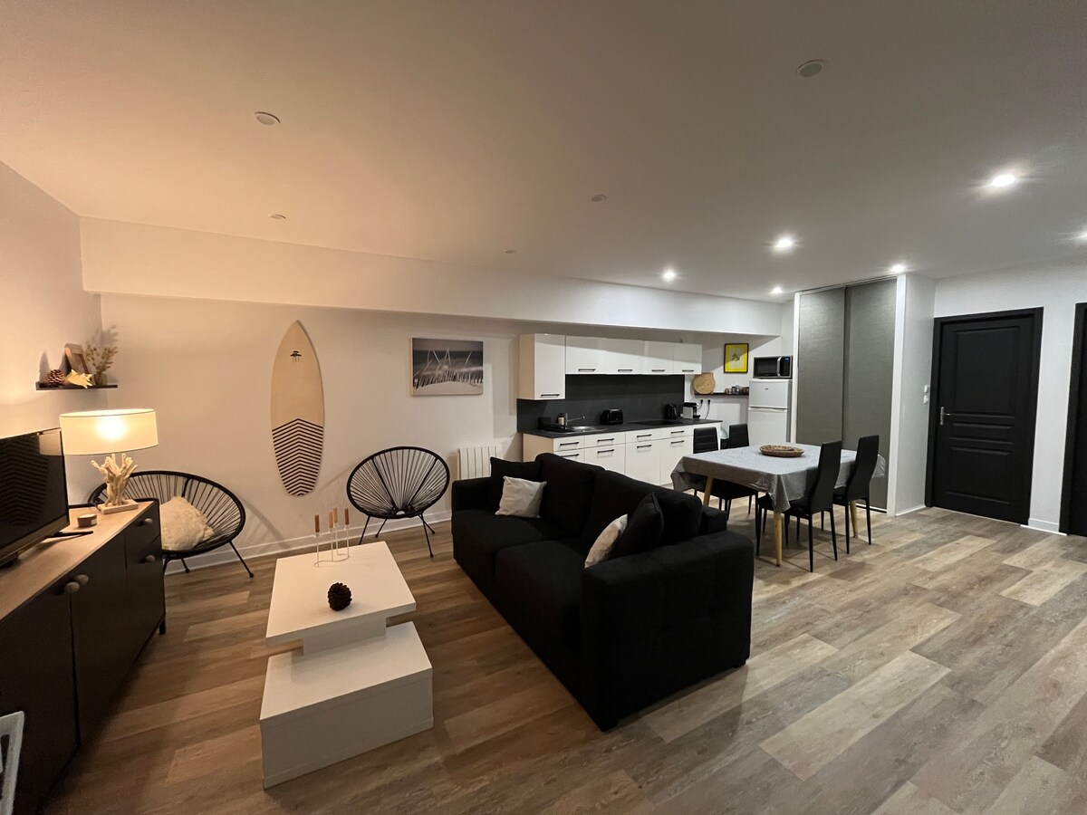 Matatagpuan sa ilalim ng mga oaks at tahimik, inaanyayahan ka naming tuklasin ang aming kaakit - akit na bagong 40 m2 studio, na perpektong matatagpuan sa pagitan ng Arcachon at Cap Ferret. Nilagyan ang maluwag at komportableng studio na ito ng modernong kusina, nababaligtad na air conditioning, at workspace na nilagyan ng fiber. May paradahan na may posibilidad na i - recharge ang iyong de - kuryenteng sasakyan.