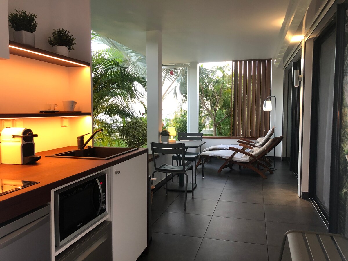 Maligayang Pagdating sa Residence Cadence. Matatagpuan sa gitna ng isla, sa distrito ng Camaruche, ang bagong 45 m2 apartment na ito na matatagpuan sa isang bagong tirahan sa ground floor ay nag - aalok ng maraming asset. Mayroon itong terrace, double bedroom, malaking banyong may double sink at walk - in shower, at kusinang kumpleto sa kagamitan at sala. Ang moderno at tropikal na dekorasyon nito ay magdadala sa iyo sa isang paglalakbay!