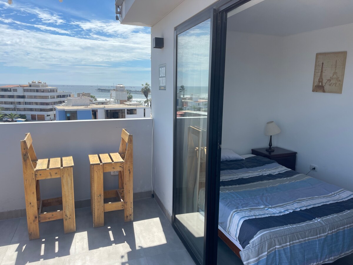 Buong apartment na paupahan sa presyong iyon. Magkakaroon ka ng kahanga-hangang panoramic view ng dagat. Maganda ang lokasyon dahil nasa pinakatahimik at pinakasentrong bahagi ito ng esplanade, kung saan matatanaw ang dagat sa kanan ng pier. Puwede kang pumasok mula sa Calle Quiñonez sakay ng kotse mo o mula sa Malecon Seoane na naglalakad mula sa dagat. Gumawa ng mga di - malilimutang alaala sa natatangi at pampamilyang tuluyan na ito. 15 metro ang layo sa downtown Chiclayo at napakalapit sa mga pinakamahalagang museo sa rehimpapang Lambayeque. Inaasahan naming makita ka!