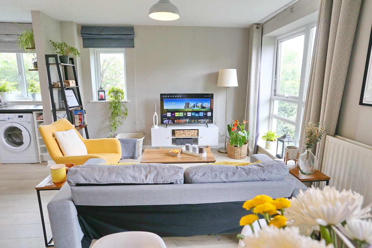Mag‑enjoy sa modernong 2 bedroom flat na perpekto para sa mga concert, football, at madaling paglalakbay sa lungsod. Sa loob, may maliwanag na sala na may malalambot na upuan at smart TV para makapagpahinga ka nang komportable. Kumpleto ang kusina para sa pagluluto ng pagkain sa bahay. May dalawang maluwag na kuwartong may double bed kung saan puwede kang magpahinga, at may makinis na banyong may bathtub kung saan puwede kang magrelaks pagkatapos ng mahabang araw ng paglalakbay sa Manchester o pagdalo sa mga event na malapit lang.