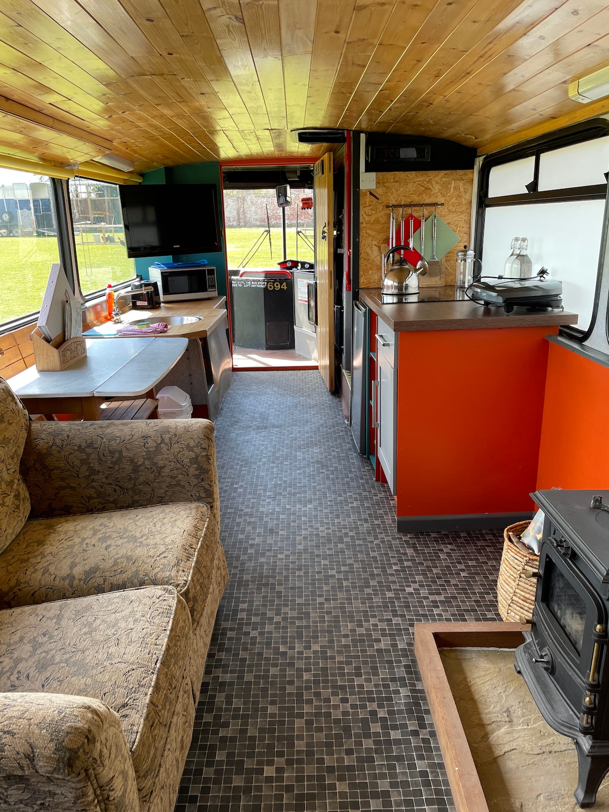 "Rex the Bus" is unique, fun and just a little bit quirky. This double decker bus has been converted to the highest standard and connected to mains electricity, water and drainage. Enjoy panoramic views of the countryside from the windows, watch the sunrise from your double bed or cabin bunk bed. Heating and a wood-burner will keep you warm and snug, whilst the kitchen area provides plenty of space to cook up a delicious meal. There is a shower downstairs and a loo and basin upstairs.