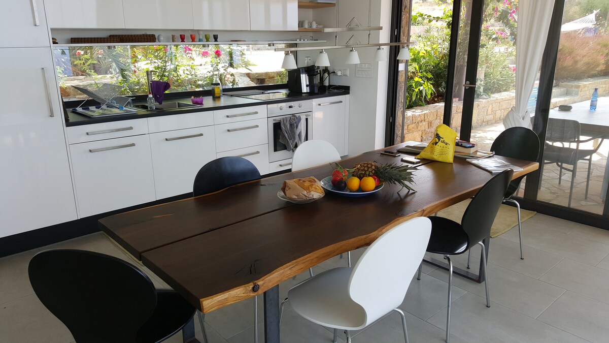 Ang marangyang villa na may pribadong pool at direktang access sa sandy beach, na napapalibutan ng tahimik na patyo na may mga nakamamanghang tanawin, ay nangangako ng hindi malilimutang bakasyon! Ang pribadong pool, na nasa loob ng maaliwalas na berdeng hardin, ay ang perpektong lugar para makapagpahinga kasama ng iyong paboritong inumin habang hinahangaan ang kahanga - hangang paglubog ng araw ng Navarino o tinatangkilik ang masasarap na pagkain na inihanda na may mga sariwang lokal na sangkap. Ang kapaligiran ay idyllic: romantikong beach, kumikinang na gintong buhangin, at isang malinaw na asul na kalangitan ay lumilikha ng isang kaakit - akit na s