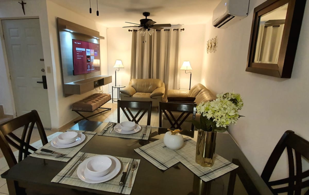 Masiyahan sa isang lugar na malapit sa paliparan, buong bahay na may dalawang silid - tulugan at lahat ng kailangan mo para sa isang trabaho o biyahe ng pamilya. Matatagpuan sa loob ng kontroladong kolonya ng access, na nagtatampok ng mga parke, berdeng lugar, korte at larong pambata. Napakalapit sa mga pangunahing daanan at tindahan ng Como Soriana, Oxxo.