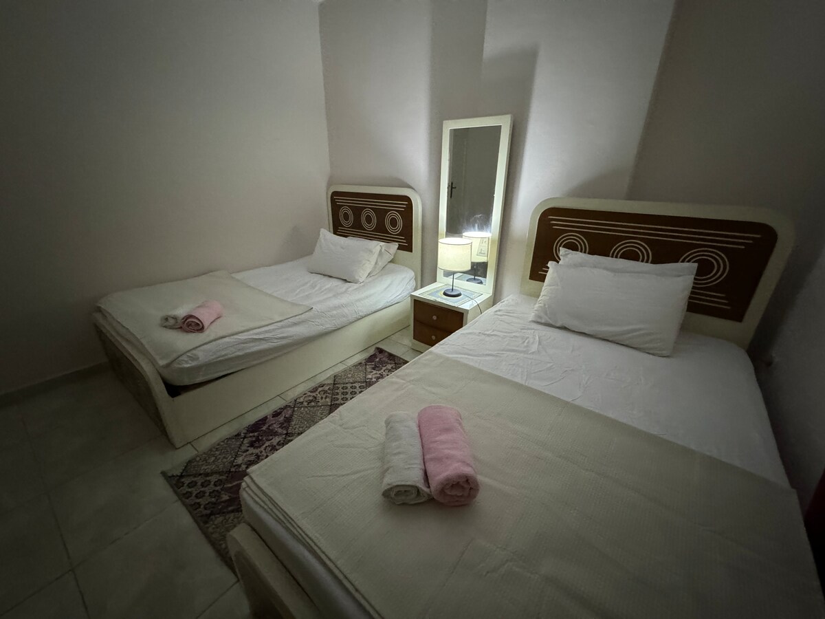 Dalhin ang buong pamilya sa magandang lugar na ito na may maraming lugar para magsaya. Matatagpuan mismo sa baybayin ng Mediterranean, ang 2 - bedroom na may 3 higaan na ito ay nagbibigay sa iyo ng pakiramdam ng kapayapaan, espasyo at katahimikan! Kalinisan, tidiness at welcoming kapaligiran ay ang aming mga halaga at motto! Ang Gleem ay isang komersyal na hub sa Eastern Alexandria! Mahahanap mo ang lahat ng uri ng mga pamilihan at restawran sa paligid!Ibig kong sabihin, nasa harap mo ang Gleem Bay! Palagi kaming makikipag - ugnayan para sa anumang tanong o payo