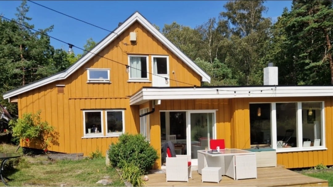 Velholdt hus i fredelig nabolag med god atmosfære og i umiddelbar nærhet til både sentrum, sjøen og skogen, strender, golfbaner og turstier. Kun 10 minutters gange til brygga og sentrum. 3 soverom og en stor terrasse rundt huset med gassgrill, og hagemøbler. I stuen er det 75» TV med flere strømmetjenester og de fleste kanaler, stor sofa og peis. På soverommene sover dere i komfortable dobbeltsenger i god kvalitet. Nytt kjøkken med alt nødvendig utstyr.