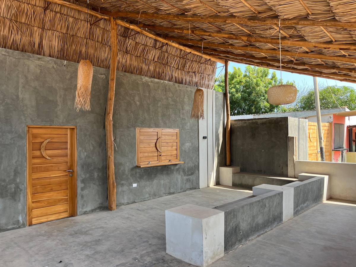 En el corazón de la animada calle de Adicora, encontrará todas las delicias para complacerle y las alegrías de la vida nocturna. Su gran terraza le permitirá relajarse bajo el techo de palmeras y su cocina abierta le permitirá almorzar en la mesa Luna. La cocina está totalmente equipada. La villa dispone de dos amplios habitaciones climatizadas con 2 camas matrimoniales y una cama individual. El gran salón ofrece la posibilidad de colocar hamacas para disponer de más espacio para dormir.