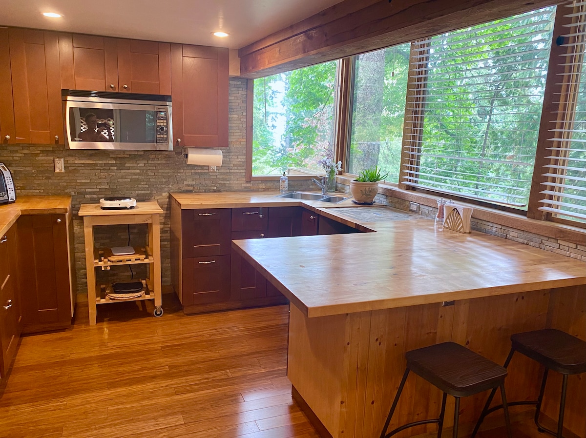 We are nestled among the Douglas Firs and Western Cedars on a rock. We call it our treehouse. 5 minute drive, 25 min walk (hill involved) from the ferry/Cove/restaurants. 10 min walk to Miller's Landing Beach, wonderful swimming, overlooking the North Shore Mountains. 10 min walk to Crippen Regional Park! In all directions there are extensive trails! On bus rte This is a dream suite with its own deck, outside table, fully equipped mini kitchen, and lots more! We live in Main house. lic#0977