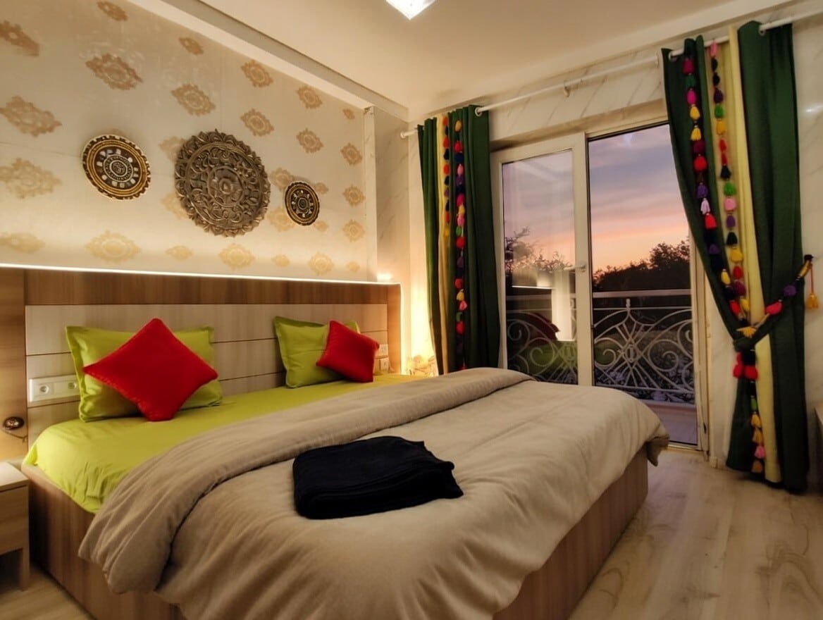 Vrindavan's Stunning Luxurious Suite - tasteful colors, corners & more 📍 Prime Location: ✔ Prem Mandir – 3 km (10 min) ✔ ISKCON Temple – 3.5 km (12 min) ✔ Banke Bihari Temple – 4 km (15 min) ✨ Why Stay Here? ✔ Luxurious box-style bed for ultimate comfort ✔ Inspired by Rajasthan’s folklore & vibrant culture ✔ 24x7 Lift | High-Speed WiFi | Fully Stocked Amenities Discover a unique blend of urban luxury and Indian heritage in this 11th-floor designer suite with breathtaking views. Welcome Home!