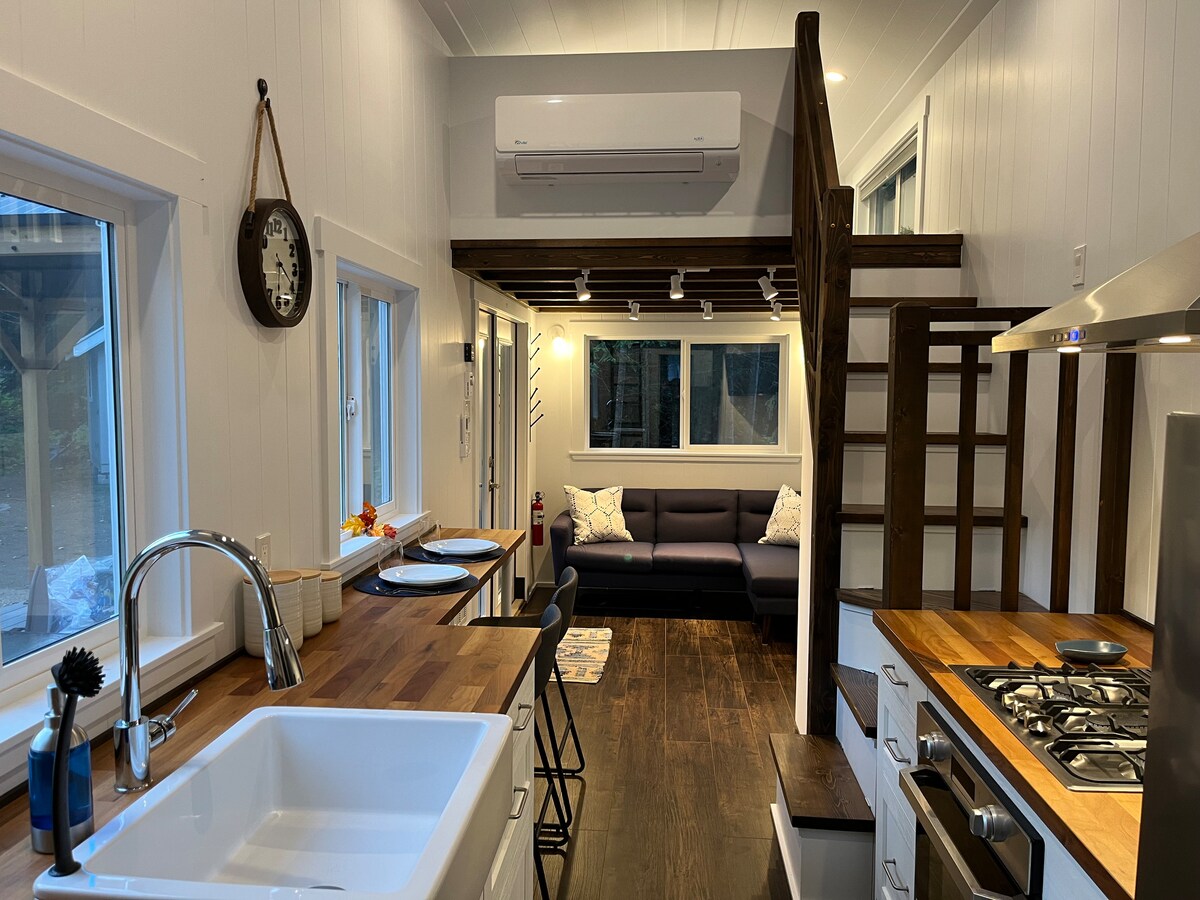 Moosu Guest House is a railroad style cabin designed for two people with 12 foot ceilings and floor to ceiling windows in the bedroom for a superb stargazing experience. The private outdoor spa features a salt water cedar hot tub and barrel sauna. Turkish spa towels and cozy robes are provided to complete the spa experience. As part of your stay you will be welcomed with a package including coffee from Nelson’s two iconic roasters Oso Negro and No6 Coffee Co, and tea from Nelson’s Virtue Tea.
