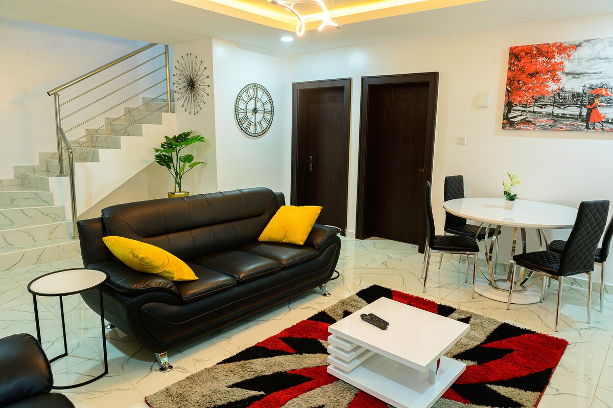 Forget your worries in this spacious and serene space. This home is newely built (2021) and fully furnished! Less than 30 minutes from Abuja Airport! Here are a couple of amenities that are included in the home: * Solar power * Security Staff * Washer and Dryer * Wireless Internet * Indoor Bar * New Kitchen w latest appliances * Flat screen TV in each room * Full bathroom for each room with shower w/ detachable shower head * Private residence with gate * Staff on-site to assist you when needed