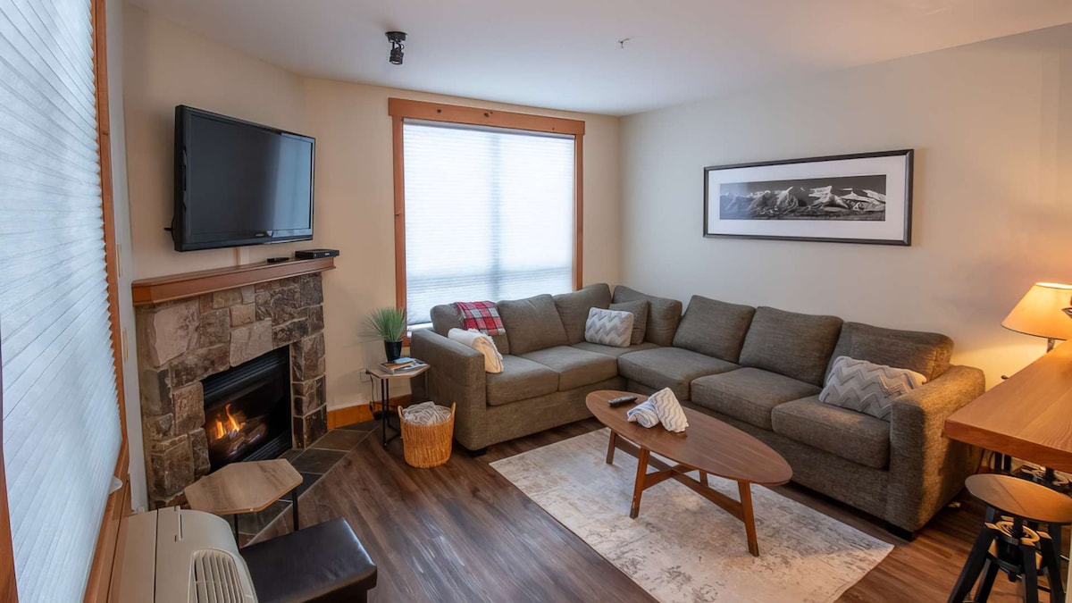 Nagtatampok ang tahimik na suite sa itaas na palapag na ito na napapalibutan ng mga tanawin ng bundok ng maaliwalas na sala, fireplace, at sofa bed na may multimedia center para gawing kasiya - siya ang iyong pamamalagi. May komportableng king size bed ang pangunahing kuwarto. Mayroon kaming kusinang kumpleto sa kagamitan at labahan para sa iyong kaginhawaan. Mag - enjoy sa access sa lahat ng amenidad kabilang ang underground heated parking, fitness room, pool, hot tub, at steam room. 5 minuto lang ang layo mula sa burol at maigsing lakad papunta sa mga restaurant at bar.