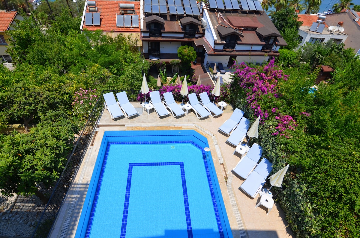 Our boutique hotel is located in Karagözler, one of the most beautiful areas of Fethiye. Its proximity to the sea is 100 meters. It is has a magnificent sea view and nature view. Due to its location, a gentle continuous breeze blows. All beaches in Fethiye can be reached by public transport. It is 5 minutes away from Fethiye's best restaurants. If you want, you can get breakfast by paying extra. We are waiting for you, our valued guests, for a pleasant holiday...