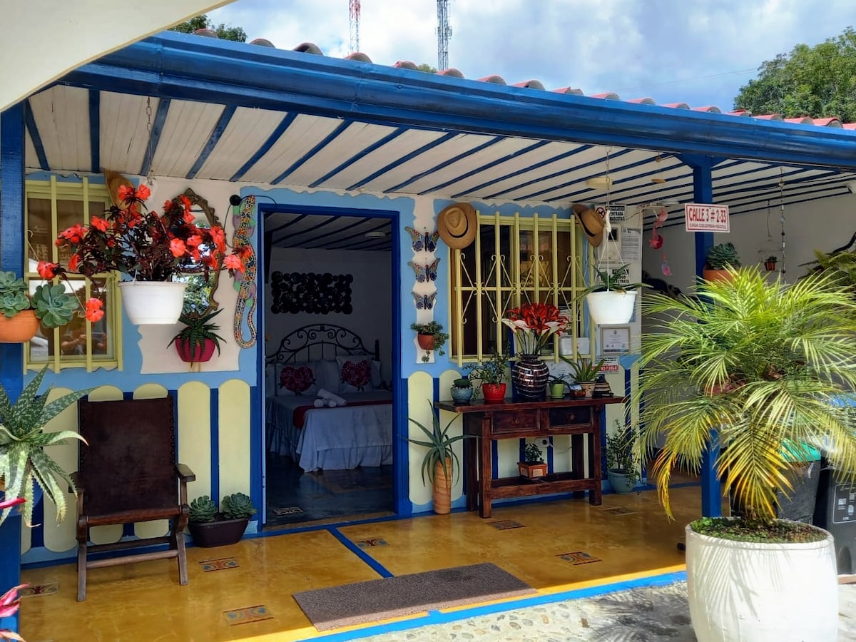 Binibigyan ka ng property na ito ng pagkakataong masiyahan sa tahimik na bansa at residensyal na kapaligiran na 3 bloke lang ang layo mula sa Calle Real at sa pangunahing parke ng Salento at isang bloke lang mula sa exit papunta sa Cocora Valley. Salento - isang kaakit - akit na bayan na puno ng mga lumang pinto at facade kahapon, nag - aalok kami sa iyo ng perpektong kapaligiran para magpahinga, magbasa at mag - enjoy ng masasarap na Colombian na kape.