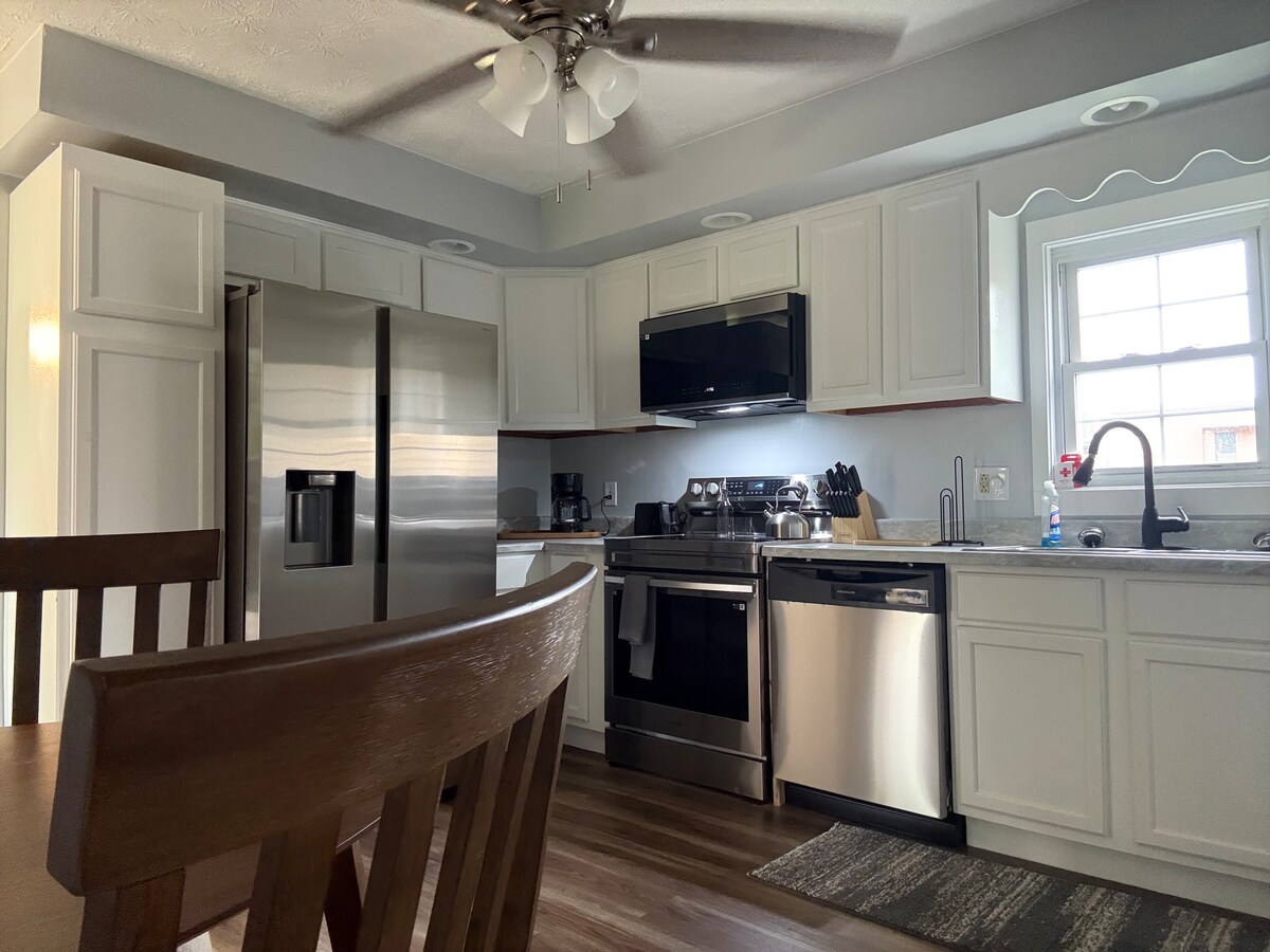 MAALIWALAS, KAKAIBA, AT ILANG MINUTO MULA SA DOWNTOWN. Isa itong bagong gawang bahay na may tatlong silid - tulugan. Napakaluwag na may paradahan sa labas ng kalye. Lahat ng kahoy na sahig at maayos na naka - tile na shower. Dalawang queen size na kama sa kuwarto at isa at dalawa. Bakante ang tatlong silid - tulugan. Malaking kainan sa kusina, washer at dryer, pasukan sa gilid at harap. Maliit na pribadong bakuran.