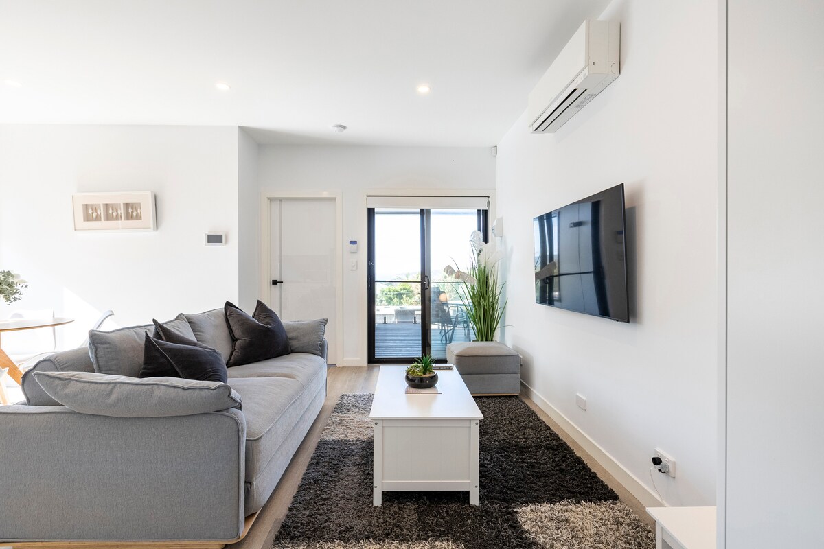 Welcome to Room With A View, a contemporary apartment located moments away from the Dromana Foreshore on the beautiful Mornington Peninsula. This property is perfectly situated to discover local wineries, cafes, market stalls and the infamous Peninsula Hot Springs. A great spot for a romantic getaway! We have now added a sun deck for sun baking, a heated spa which can be used all year round and a heated swim spa for the Spring and Summer months.