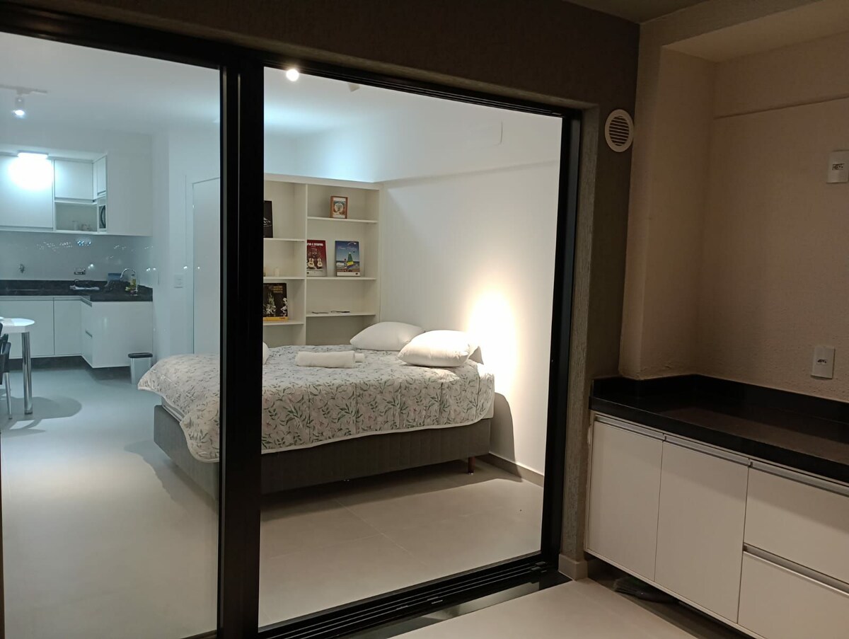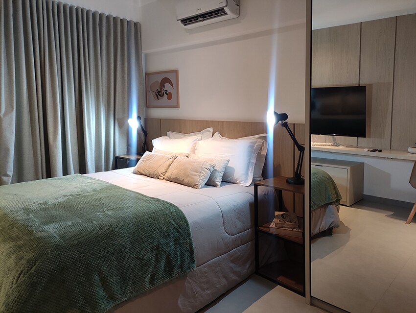 39m2 Studio Apartment, kung saan matatanaw ang kalye, bahagi ng anino, queen bed + sofa bed. Pagho - host ng 2 may sapat na gulang at 2 bata o hanggang 3 may sapat na gulang para maging komportable. Naka - air condition at may lahat ng pangunahing kagamitan, libreng paradahan. Matatagpuan sa pinakamagandang rehiyon ng Marília, sa tabi ng Avenida das Esmeraldas, malapit sa mga supermarket, bar, restawran, beauty salon at parmasya. Ang condominium ng gusali ay mayroon ding Coworking space, gym , at libreng laundry space.
