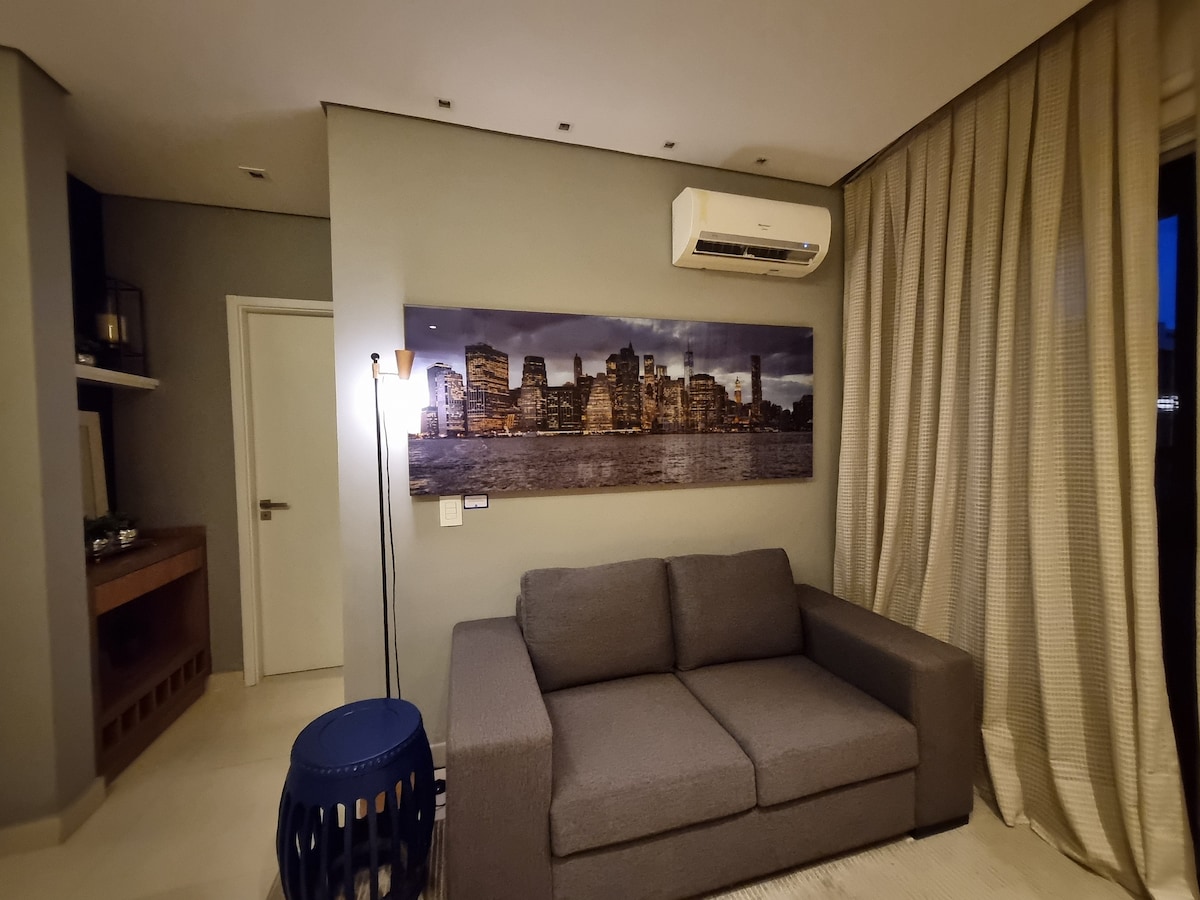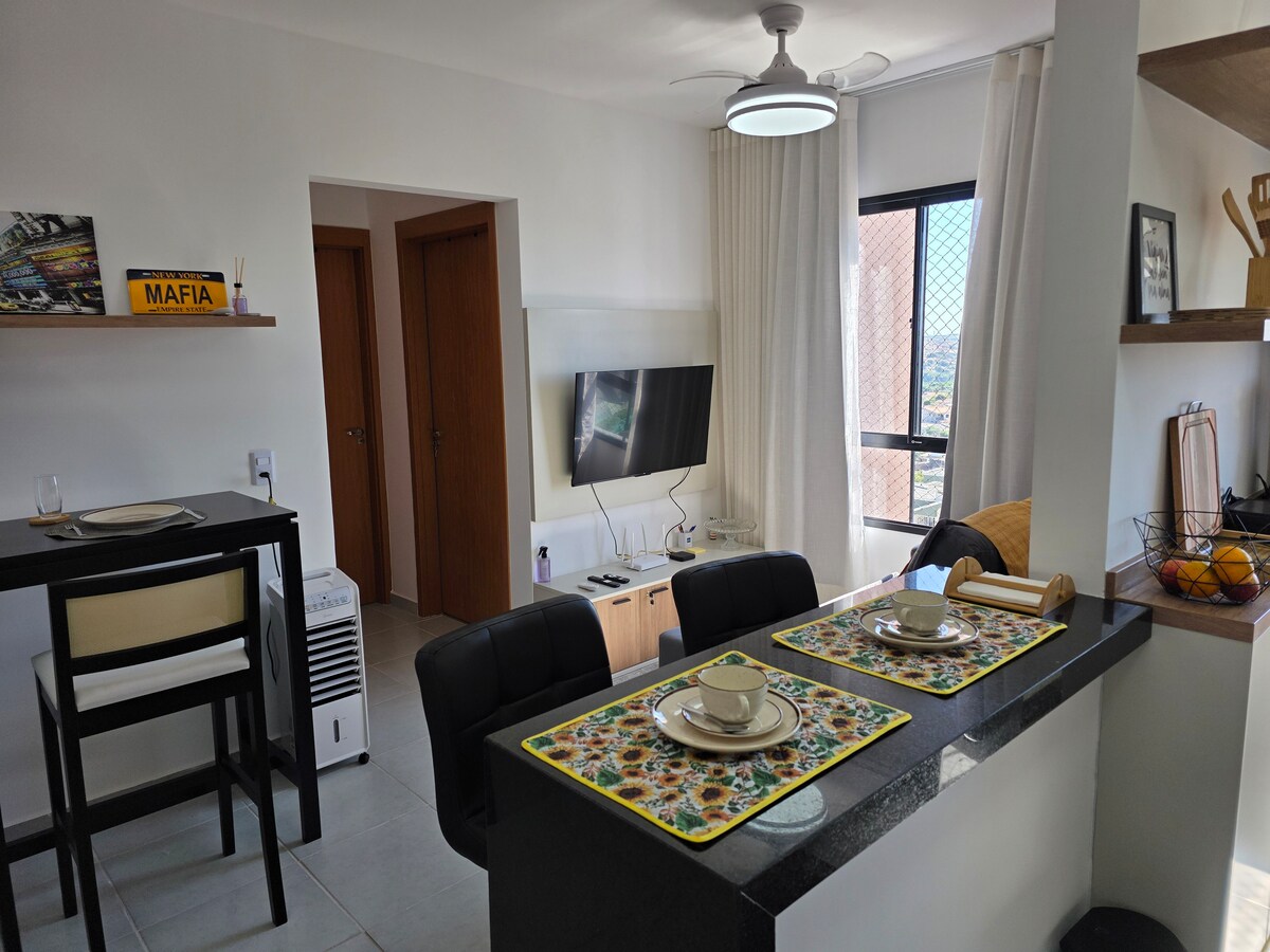 Studio apartment na 39m2,kumpleto ang kagamitan. May pribilehiyong lokasyon sa pinakamagandang lugar sa Lungsod ng Marília - SP, 20 metro mula sa Av. das Esmeraldas, ang trendiest sa lungsod. Malapit sa Esmeraldas Shopping Mall, maraming restaurant at pinakamahusay na supermarket (Tauste at Trust). Mayroon itong malaking gourmet balkonahe, na may bahagyang tanawin ng avenue at electric barbecue. Bukod pa sa mga amenidad ng apartment, ang common area ng condominium ay may gym, sauna, spa, laundry room, at coworking environment.