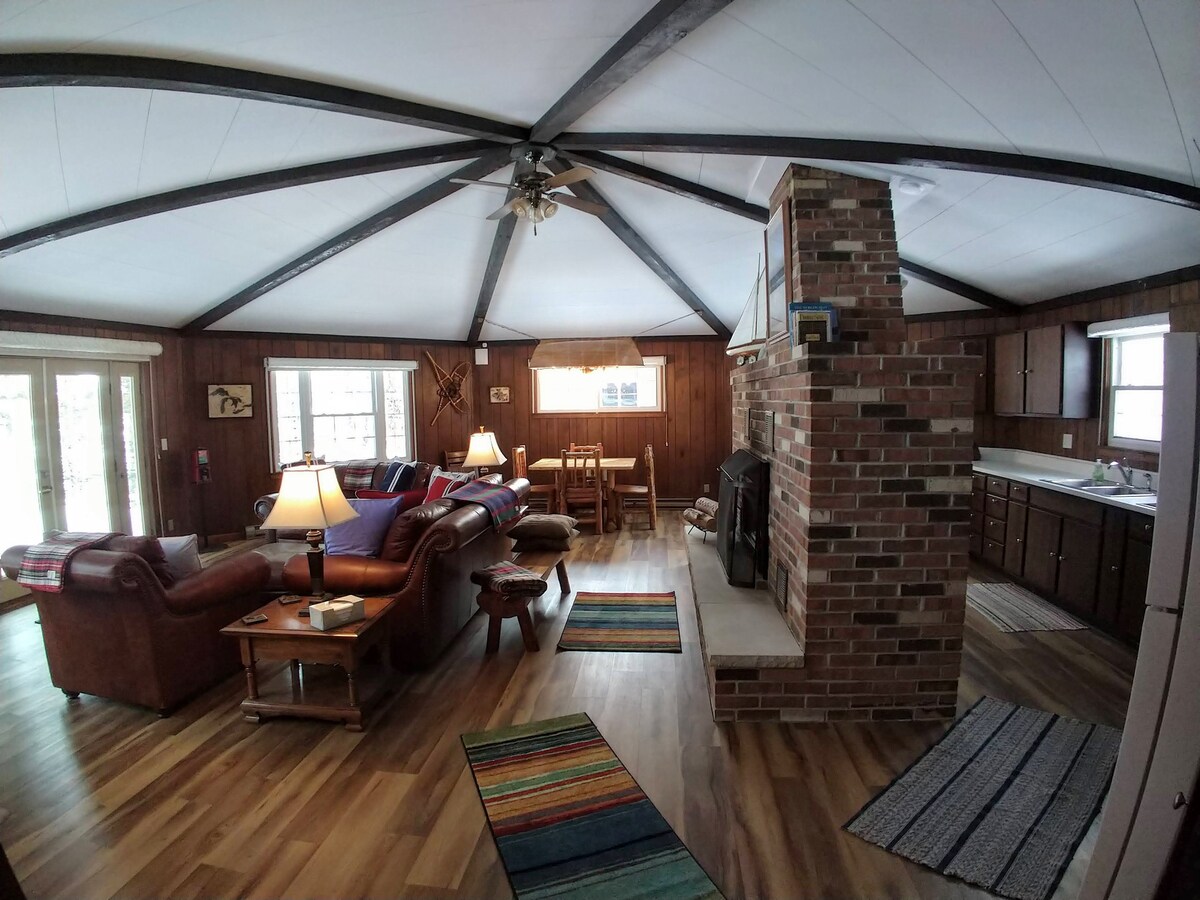 Kapansin - pansin na lugar ng pagtitipon para sa pamilya at mga kaibigan. Tinatanaw ng hapag - kainan para sa 12 ang lawa. Dalawang malalaking lugar ng pamumuhay. Panloob na fireplace at singsing sa sunog sa labas. Kusinang kumpleto sa kagamitan. Apat na silid - tulugan na may mga king bed, tatlo ay mayroon ding kambal na bunks. 3 buong banyo, dalawang malaking kapasidad na mga heater ng tubig. Tinatanaw ng gas grill at outdoor picnic area ang 550 acre crystal clear lake na may mga water toy (kayak, sup, canoe, rowboat, tingnan ang guidebook). Mga hakbang papunta sa lawa, ilang minuto papunta sa ski hill. Dock 5/23 -9/15