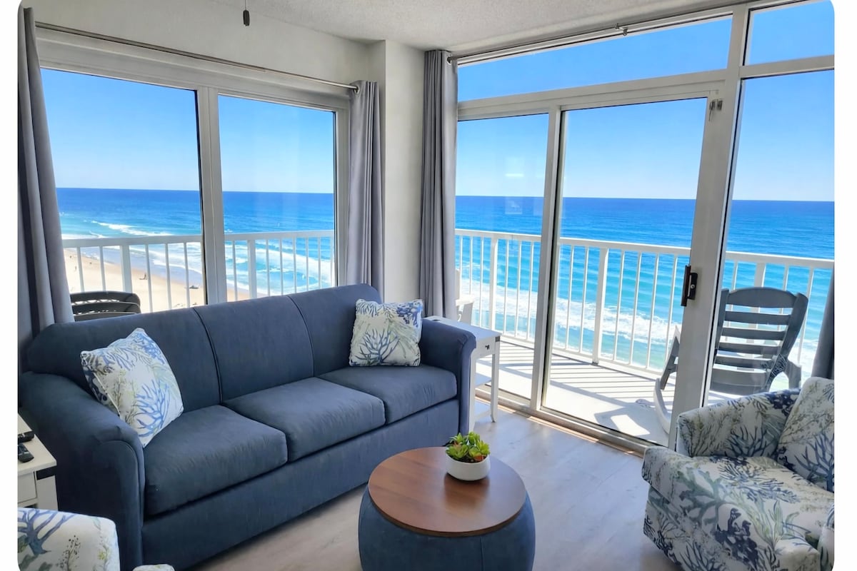 🌊 Tuklasin ang bagong na - update na 2Br/2BA suite na ito na may mga nakamamanghang direktang tanawin sa tabing - dagat mula sa bawat kuwarto. Matatagpuan sa gitna ng Myrtle Beach, ang maluwang na suite na ito ay tumatanggap ng hanggang 10 bisita, na perpekto para sa mga pamilya o grupo na naghahanap ng relaxation at kasiyahan 🌅 Ang parehong mga silid - tulugan ay nagtatampok ng mga pribadong balkonahe at ang sala ay may mga pambalot na bintanang mula sahig hanggang kisame, na nag - aalok ng 360 - degree na tanawin ng nakamamanghang Atlantic Coast✨ Sip coffee sa balkonahe at makinig sa mga alon na may mga nakakarelaks at walang katapusang masasayang alaala