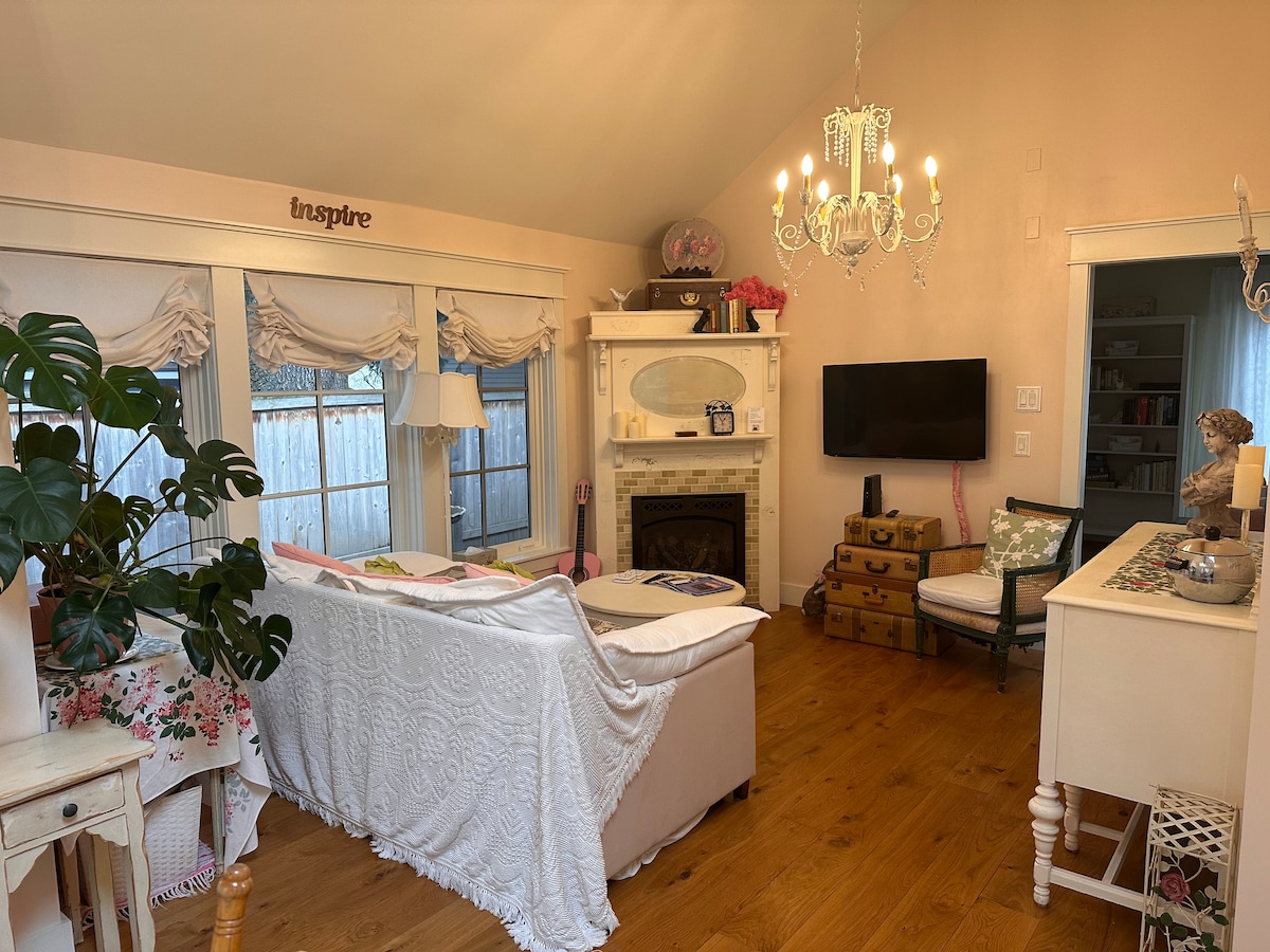 Ang aming B&b ay isang *karanasan* at hindi lamang isang lugar para magpalipas ng gabi. Matatagpuan sa coveted neighborhood ng Multnomah Village, isa itong sobrang romantikong garden cottage style gem. Dito, mararamdaman mong parang royalty na natutulog sa inukit na mahogany na apat na poste na QUEEN SIZE na higaan, na niyayakap ng kamangha - manghang kutson, at napapalibutan ng mga kulay ng designer bed, print at throw pillow. Makakakita ka ng napakarilag at nangungunang tile na banyo, modernong magandang kusina, at maraming kaaya - ayang sorpresa.