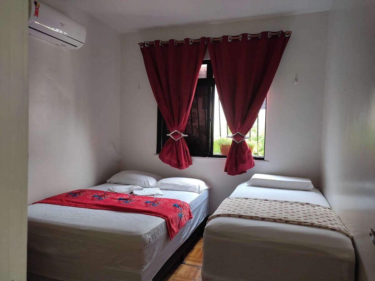 Ang aming suite ay simple, malinis at malawak, perpekto para sa mga naghahanap ng komportable at tahimik na lugar para magpahinga at mag - enjoy sa lungsod. Sa unang palapag ng gusali, na may access sa pamamagitan ng hagdan, ang aming tuluyan ay isang kapaligiran ng pamilya na may plus ng pagiging napakahusay na matatagpuan at may madaling access sa mga restawran at supermarket. Malapit sa sentro ng lungsod, sa Beira Mar, at sa Central Market ng Fortaleza. May kusina ang naka-air condition na suite na pangkaraniwan sa ibang bisita.