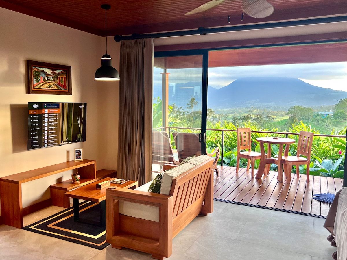 Un hospedaje para escapar de la rutina y conectar con la naturaleza, tiene un diseño moderno con una cálida decoración, rodeado de naturaleza donde podrás observar muchas aves, una linda vista al volcán, balcón, terraza, una refrescante piscina y jacuzzi privado. Un lugar ideal para parejas, amigos o para que puedas teletrabajar tranquilamente. Ubicados estratégicamente cerca de todas las actividades principales y a tan solo 2.5 km del centro de La Fortuna y a 1 km de La catarata La Fortuna.