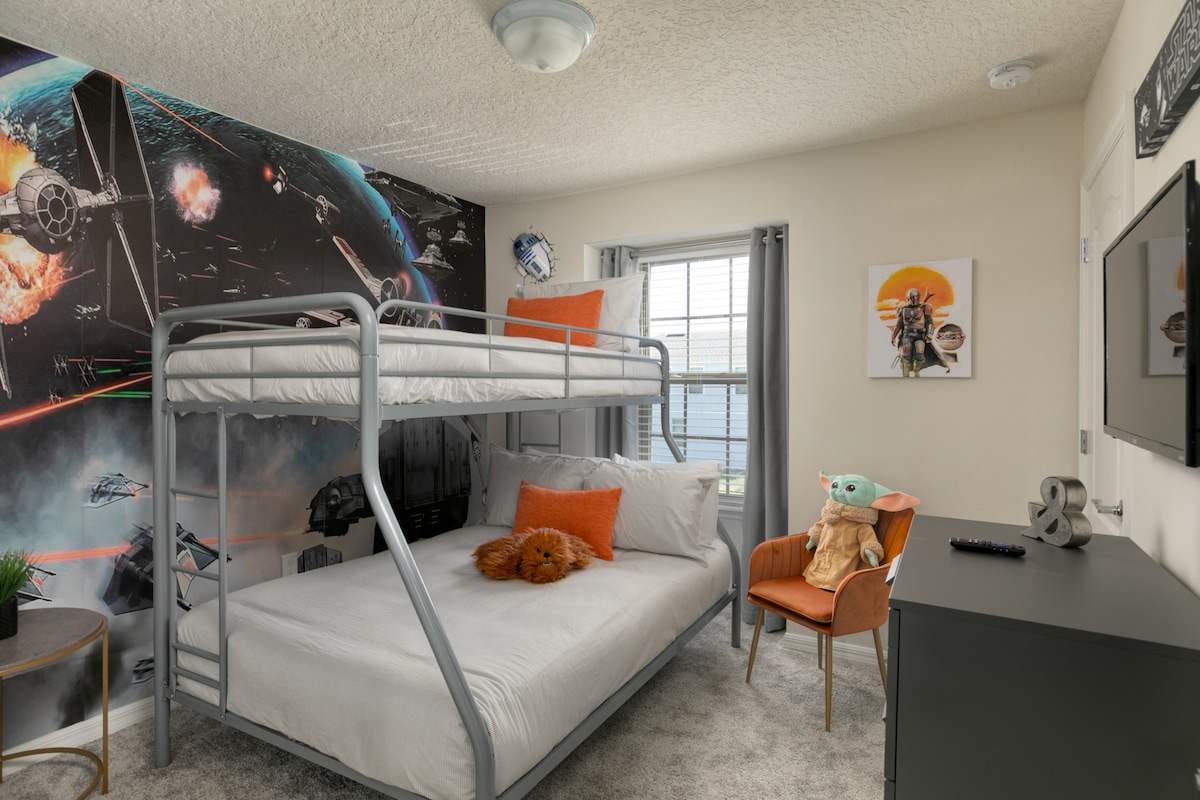 Ang magandang townhouse na ito ay ang perpektong lugar para sa mga pamilya at magkakaibigan upang lumikha ng mga di-malilimutang alaala sa Orlando.Talagang magiging komportable ka dahil sa magandang dekorasyon, maluluwang na sala at kainan, at kumpletong kusina. Lumabas para masiyahan sa sarili mong pribadong pool na may mga sun lounger at BBQ grill, na perpekto para sa pagsipsip ng sikat ng araw ng Florida.Magandang maging sa mga bata at matatanda ang dalawang silid-tulugan na may tema ng Mickey Mouse at Star Wars.