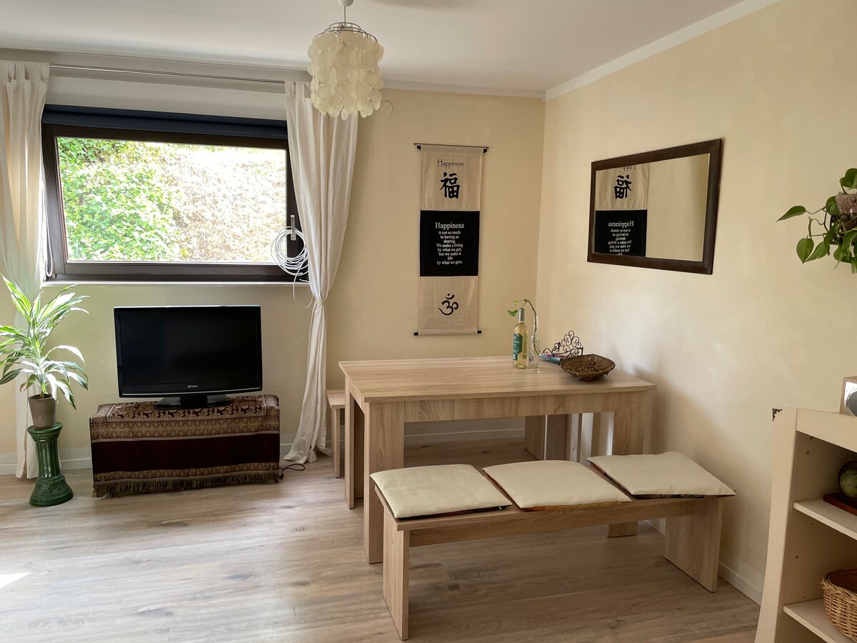 Ang naka - istilong tuluyan na ito ay perpekto para sa mga mag - asawa, pamilya, propesyonal na nagtatrabaho sa lugar ng Bonn, nagbabakasyon o nangangalakal ng mga patas na bisita sa lugar ng K/BN. Matatagpuan ang apartment sa isang bagong inayos na bahay na may terrace at access sa hardin at kagubatan. Napakalinaw na lokasyon na humigit - kumulang 3 km ang layo sa B. Godesberg. Mula roon, may magandang koneksyon sa tren papunta sa lahat ng pangunahing istasyon ng tren sa Germany. Logistically well located - Airport KölnBonn humigit - kumulang 30 km ang layo. Highway A 565 at A 552 tungkol sa 3 km ang layo.