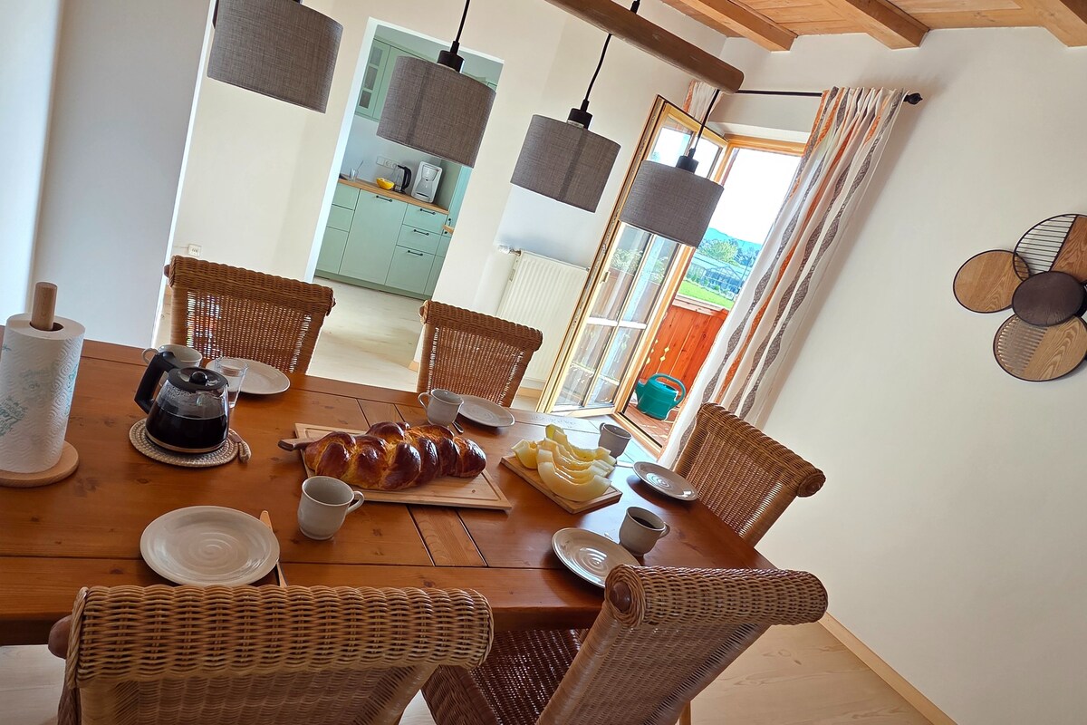 Talagang komportable sa amin ang lahat, maging ang pamilya, grupo ng mga kaibigan, mag - asawa o indibidwal. Mayroon kaming magandang apartment na 6 ang tulugan (kung kinakailangan, maaari mo ring gamitin ang sofa para sa mas maraming tulugan). Ang magandang tanawin mula sa balkonahe hanggang sa bundok ng Alps ay nagpapakita sa iyo kung gaano ka magandang lugar. Bukod pa rito, ang lapit sa Salzburg ay isang ganap na highlight: sa loob ng 5 minuto sa pamamagitan ng kotse sa hangganan at sa loob ng 15 minuto sa sentro ng lungsod.