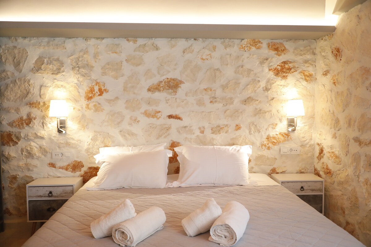Isang kaakit - akit na maliit na taguan kung saan masisiyahan ka sa tanawin mula sa itaas ng mga puno ng oliba. Talagang naiiba at kapana - panabik na pagpipilian para sa mga bisita na nasisiyahan sa hitsura at pakiramdam ng natural na toned na kahoy , makalupang kulay at tanawin para muling mabuhay ang kaluluwa. Makaranas ng dalisay na kaligayahan sa nakamamanghang jacuzzi sa labas ng aming spa Napapalibutan ng tahimik na kalikasan, isawsaw ang iyong sarili sa pagrerelaks habang natutunaw ng mainit at bubbling na tubig ang tensyon at pabatain ang iyong diwa.