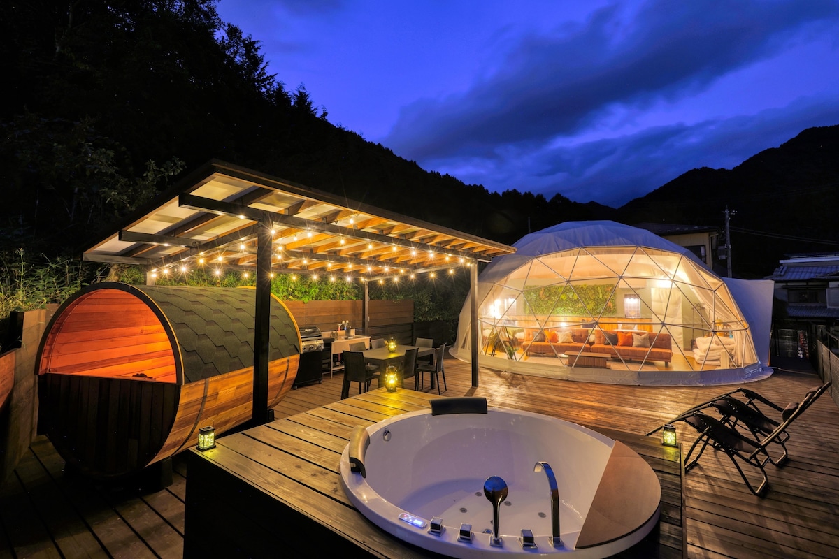 Ang lahat ng mga kuwarto ay may open - air na paliguan, sauna, paliguan ng tubig, BBQ grill, karanasan sa bonfire, hanggang 4 na tao, at isang ganap na pribadong glamping na pasilidad na hindi mainam para sa alagang hayop! Maaari mong gamitin ang gas BBQ grill, sauna, at dalhin ang iyong sariling mga sangkap nang libre! 5 minutong lakad papunta sa baybayin ng Lake Yamanaka, 5 minutong lakad papunta sa pinakamalapit na convenience store!Magandang lokasyon na may mahusay na access 10 minutong lakad papunta sa supermarket! Puwede kang magrelaks sa komportableng tent na may dome at mag - enjoy sa BBQ sa kuwartong may air conditioning at heating. Nilagyan ang lahat ng kuwarto ng Android TV at may BBQ space sa kuwarto, kaya paano ang panonood ng mga pelikula habang BBQing sa tag - ulan? Makaranas ng pambihirang karanasan sa glamping kasama ng pamilya, mga kaibigan, o mag - asawa!