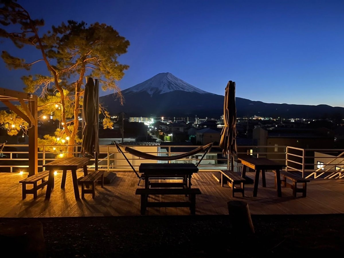 Ito ay isang buong glamping dome (8m dome tent) na may tanawin ng marilag na Mt.Fuji.May shower room, banyo, at toilet sa dome, para magkaroon ka ng komportableng pamamalagi na may air conditioning at heating.Inirerekomenda para sa mga biyahe sa grupo tulad ng mga mag - asawa, pamilya, at club ng mga batang babae. 13 minutong lakad mula sa■ Shimoyoshida Station Humigit - kumulang 8 -10 minuto sa pamamagitan ng taxi mula sa Mt. ■Fuji Station, Fuji - Q Highland Station, at Kawaguchiko Station Maglakad papunta sa mga■ convenience store at tindahan ng droga Libreng ■paradahan para sa hanggang 2 kotse (walang kinakailangang reserbasyon) ■Hanggang 6 na bisita (libreng matulog nang magkasama nang hanggang 2 taong gulang) ■Libreng WiFi Access sa mga destinasyon ng mga turista 8 minutong lakad papunta sa pasukan ng Shinkurayama Sengen Park at Churei Pagoda/19 minutong lakad papunta sa shopping street na may tanawin ng Mt. Fuji (Honmachi - dori)/7 minuto sa pamamagitan ng kotse papunta sa Fuji - Q Highland/7 minuto sa pamamagitan ng kotse papunta sa Kawaguchiko Ohashi/10 minuto sa pamamagitan ng kotse papunta sa Fuji - Yama Onsen/18 minuto sa pamamagitan ng kotse papunta sa Oshinohako/20 minuto sa pamamagitan ng kotse papunta sa Lake Yamanaka [Mga Feature] Ang pribadong deck ay humigit - kumulang 150 m², at maaari mong tangkilikin ang isang sakop na pasilidad ng BBQ, jacuzzi bath, at barrel sauna nang walang karagdagang gastos.Maaaring maging mahirap ang mga BBQ sa taglamig o jacuzzi tub dahil sa niyebe o lamig.