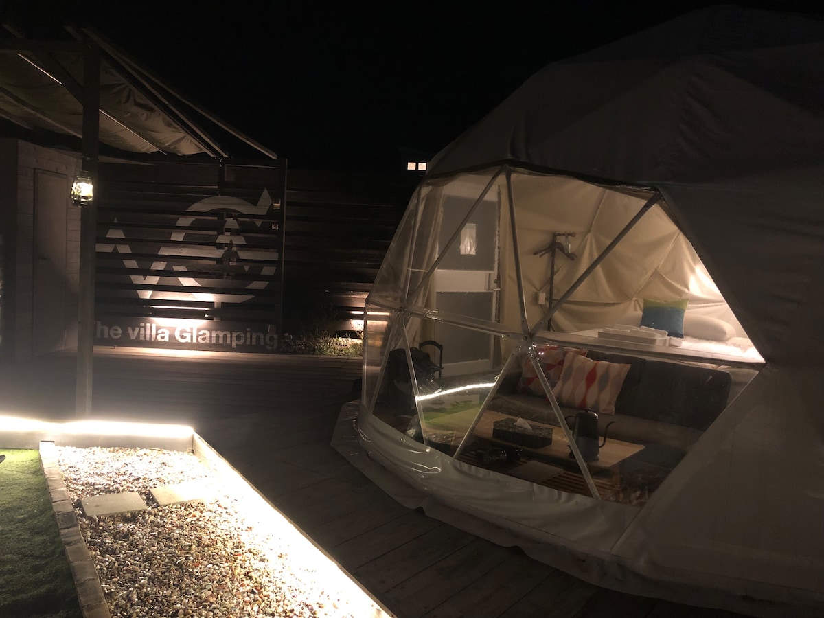 Ito ay isang buong glamping dome (8m dome) na may marilag na Mt. Fuji.Tumatanggap ito ng 8 tao. Mayroon itong shower room, banyo, at dalawang toilet sa dome para sa komportableng pamamalagi.Inirerekomenda para sa mga biyahe sa grupo tulad ng mga mag - asawa, pamilya, at club ng mga batang babae. 5 minutong lakad mula sa istasyon ng■ Kawaguchiko nang naglalakad Humigit - kumulang 8 -10 minuto sa pamamagitan ng taxi mula sa■ Fuji Station, Fuji - Q Highland Station, Taxi ■Mga convenience store, tindahan ng droga, restawran, izakayas, sa loob ng maigsing distansya Libreng ■paradahan para sa hanggang 3 kotse ■Hanggang 8 tao (libreng matulog nang magkasama hanggang 2 taong gulang) ■Libreng WiFi Access sa mga destinasyon ng mga turista 8 minutong lakad papunta sa Kawaguchiko//7 minuto sa pamamagitan ng kotse papunta sa Fujikyu Highland//10 minuto sa pamamagitan ng kotse papunta sa Fujiyama Onsen/20 minuto sa pamamagitan ng kotse papunta sa Oshino Hakai/20 minuto sa pamamagitan ng kotse papunta sa Yamanakako/20 minuto sa pamamagitan ng kotse papunta sa Fujiten sky resort/15 minuto sa pamamagitan ng kotse sa Sengama [Mga Feature] Humigit - kumulang 100㎡ ang pribadong deck, at nasa labas ang pasilidad ng covered gas BBQ.