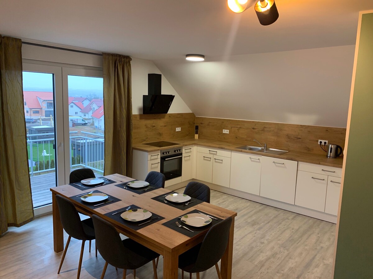 Dalhin ang buong pamilya sa magandang lugar na ito na may maraming espasyo para makapagpahinga ka. Sa balkonahe man, sa beach chair ng conservatory, o sa komunal na hardin, maraming lugar na matutuluyan. Ang apartment ay matatagpuan sa ika -1 palapag at may maluwag na living area na may window front sa berde. Bilang karagdagan sa dalawang silid - tulugan, ang bawat isa ay may 140cm na lapad na kama, mayroong dalawang iba pang mga single bed sa attic. Ang kusina ay bago at mahusay na kagamitan.
