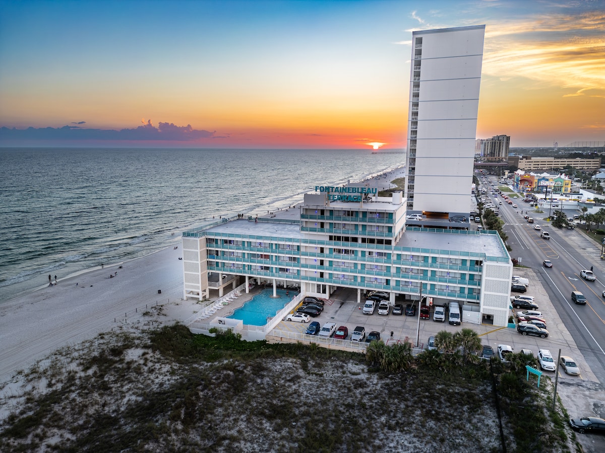 Ang aming studio condo ay matatagpuan sa isang magandang white sand beach sa Panama City Beach! Ang aming gusali, Fountainebleau Terrace, ay isa sa mga orihinal at pinaka - prestihiyosong hotel na itinayo sa lugar noong 1965. Mula noon ay na - update na ang mga pagsasaayos upang maibalik ang kagandahan at kagandahan ng modernong panahon sa kalagitnaan ng siglo at pagpapanatili ng isang pakiramdam ng nostalgia. Ito ay pribado at nakakarelaks, ngunit matatagpuan sa gitna ng marami sa mga pangunahing atraksyon, restawran at libangan ng lugar! @AirSpace.Adventuressa mga social