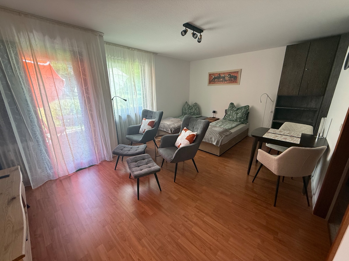 Naghihintay sa iyo ang modernong apartment na may kasangkapan at bagong inayos na studio (hindi hiwalay na silid - tulugan) na may 40 sqm na sala. Matatagpuan ang apartment sa hiwalay na bahay sa basement. Matatagpuan ito sa isang tahimik na residensyal na lugar sa malapit sa kagubatan sa perpektong panimulang lugar para sa mga aktibidad tulad ng pagbibisikleta at pagha - hike. Ang sentro ng Furtwangen at shopping ay nasa maigsing distansya sa loob ng 20 minuto. (kotse 3 min).