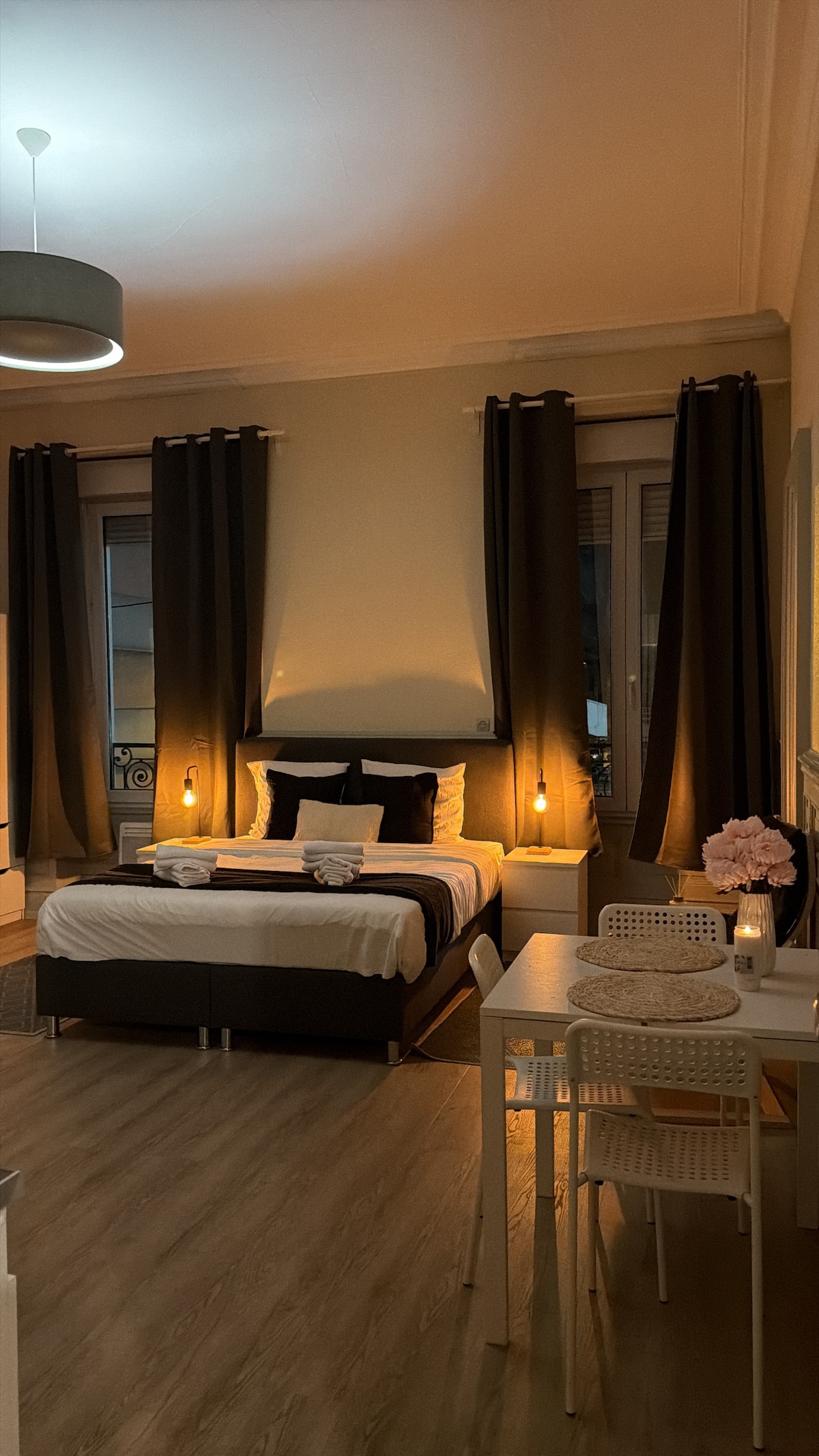 Maligayang pagdating sa L’Olympia, isang napakahusay na apartment na 85 sqm na ganap na bago, na matatagpuan sa ika -1 palapag ng isang maliit na tahimik na tirahan. Isang perpektong cocoon para sa isang romantikong bakasyon, isang kaarawan, o isang nakakarelaks na sandali para sa dalawa. • Mainam para sa nakakarelaks na weekend o romantikong sorpresa •. Available ako para sa anumang tanong o espesyal na kahilingan. • Gourmet na almusal para sa dalawa: €25 • Romantikong dekorasyon o kaarawan: €25