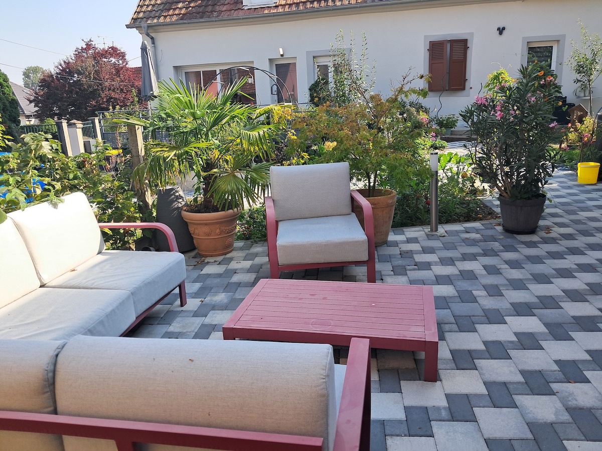 Puwede kang magparada nang libre sa patyo sa harap ng apartment. Magandang bagong independiyenteng tuluyan, napaka - tahimik, sa isang hiwalay na bahay (Karaniwang pasilyo) - NAPAKALAKING walk - in shower, travertine na banyo. - sulok na sofa, hapag - kainan para sa 2, TV, WiFi, Netflix (iyong mga code), Chromecast, lugar ng opisina. - Kusina na kumpleto ang kagamitan - Karaniwang double bed sa kuwarto ang malaking dressing room. - washing machine Sa tag - init, nakakarelaks na Zen terrace, pergola, duyan, mesa, atbp.