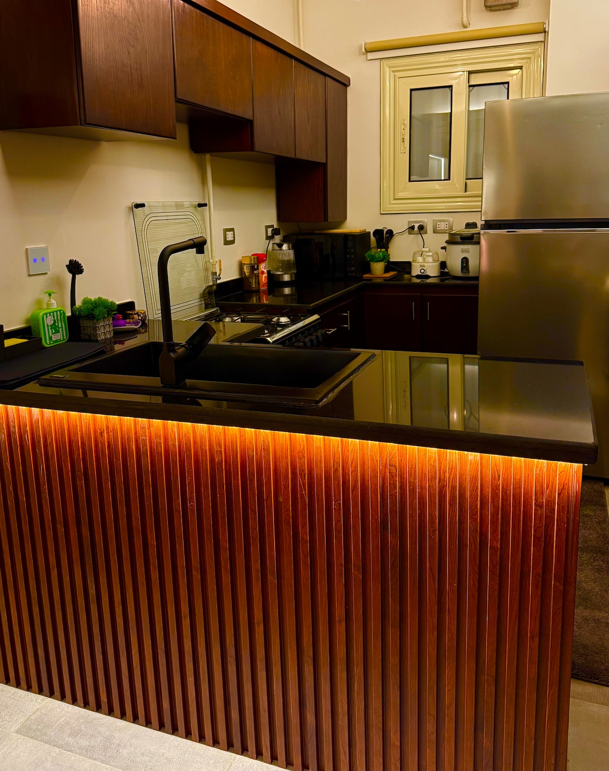 Ang maluwag na apartment na ito ay kumpleto sa kagamitan at nilagyan ng lahat ng kailangan mo para sa komportableng pamamalagi. Mamahinga at panoorin ang iyong mga paboritong pelikula at palabas sa TV sa sound system na may access sa Netflix, beIN Sports, Shahid, Panoorin ito, at Starzplay. Matatagpuan sa isang sentrong lokasyon, malapit sa lahat ng pangunahing atraksyon. Maigsing lakad lang para sa istasyon ng bus, mga tindahan, at mga restawran. Bumibiyahe ka man para sa negosyo o kasiyahan, ang moderno at naka - istilong apartment na ito ang perpektong lugar na matutuluyan.