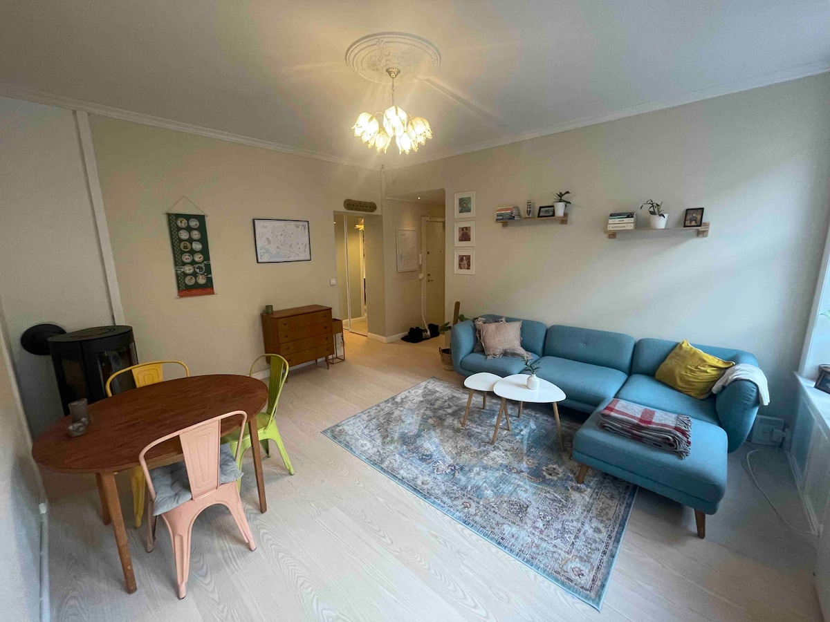 Discover an artsy gem in the historic Old Town, at the heart of Oslo! This stylish and fully equipped Nordic retreat boasts 3m-high ceilings, beautiful stucco details, and walls bursting with art. Bathed in natural light from large windows and fireplace, it offers a creative and inspiring sanctuary. Sip coffee with a view, unwind on the sunny rooftop terrace, and explore the best of Oslo's vibrant culture, parks, and city life —perfectly located to experience the true spirit of the city!