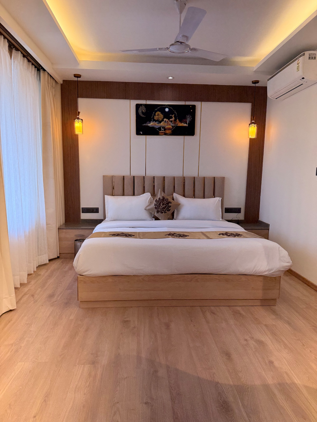 Ang Luxury Attic Suite ay isang maaliwalas at magandang tuluyan na ginawa para sa mga biyaherong naghahanap ng katiwasayan at ganda. May pahilig na kisameng yari sa kahoy, iba't ibang texture, at pribadong balkonahe kung saan matatanaw ang lambak. Tamang‑tama ito para sa mahahabang umaga, mga gabing walang pagmamadali, at tahimik na pagmumuni‑muni. Nakakapagpahinga ang bawat detalye—mula sa mga piling dekorasyon hanggang sa banayad na liwanag ng bundok. Mainam para sa mag‑asawa o solo traveler, pinagsasama‑sama ng suite na ito ang maginhawang pamamalagi at walang hanggang ganda ng katahimikan sa gilid ng burol ng Ramgarh.