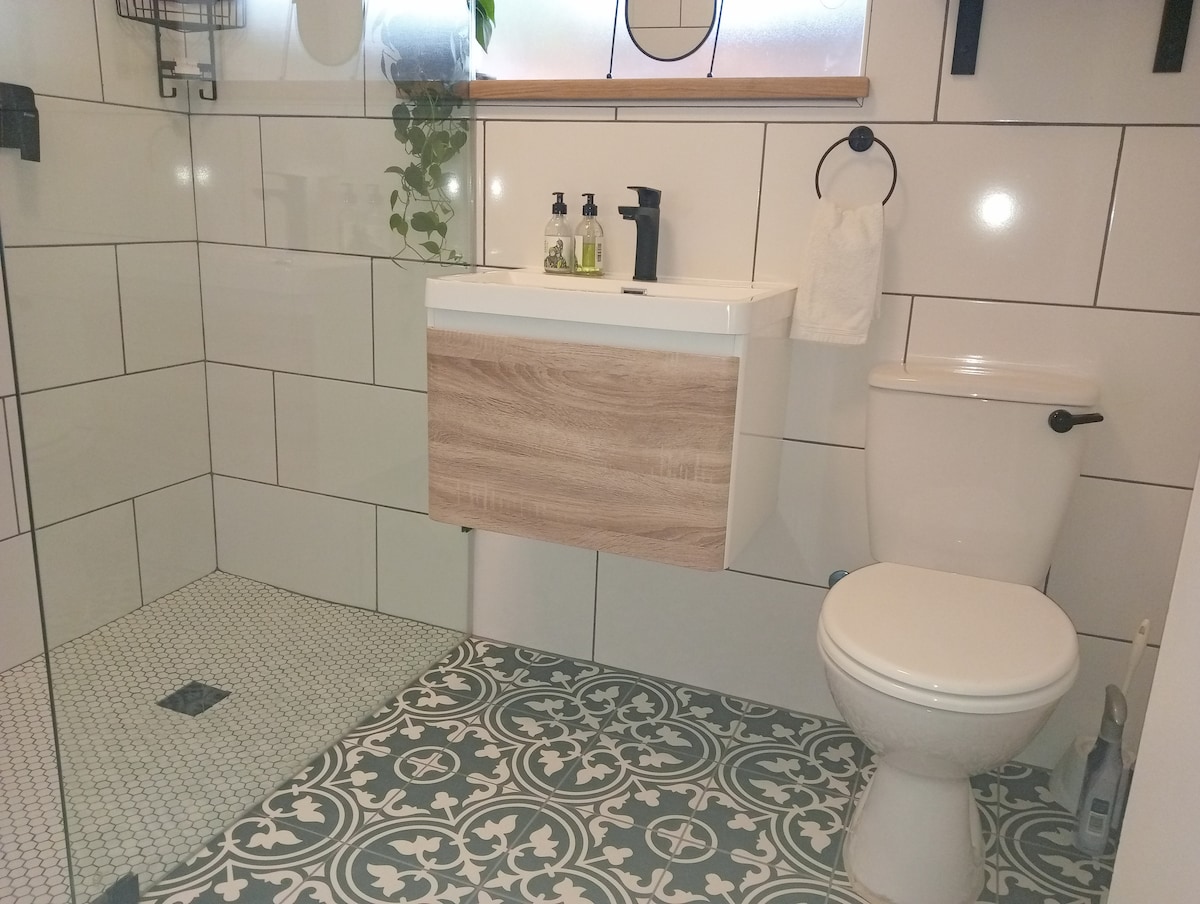 Bagong pinong modernong flat. Buksan ang yunit ng plano na may en - suite na banyo. Open plan ang pangunahing kuwarto at kailangan mong dumaan sa pangunahing kuwarto para makarating sa ikalawang kuwarto. Kumpletong gumaganang kusina na may refrigerator, oven at kalan, microwave at marami pang iba. Mga modernong muwebles at dekorasyon. Tahimik at nakakarelaks na kapaligiran. Isa itong unit sa itaas.