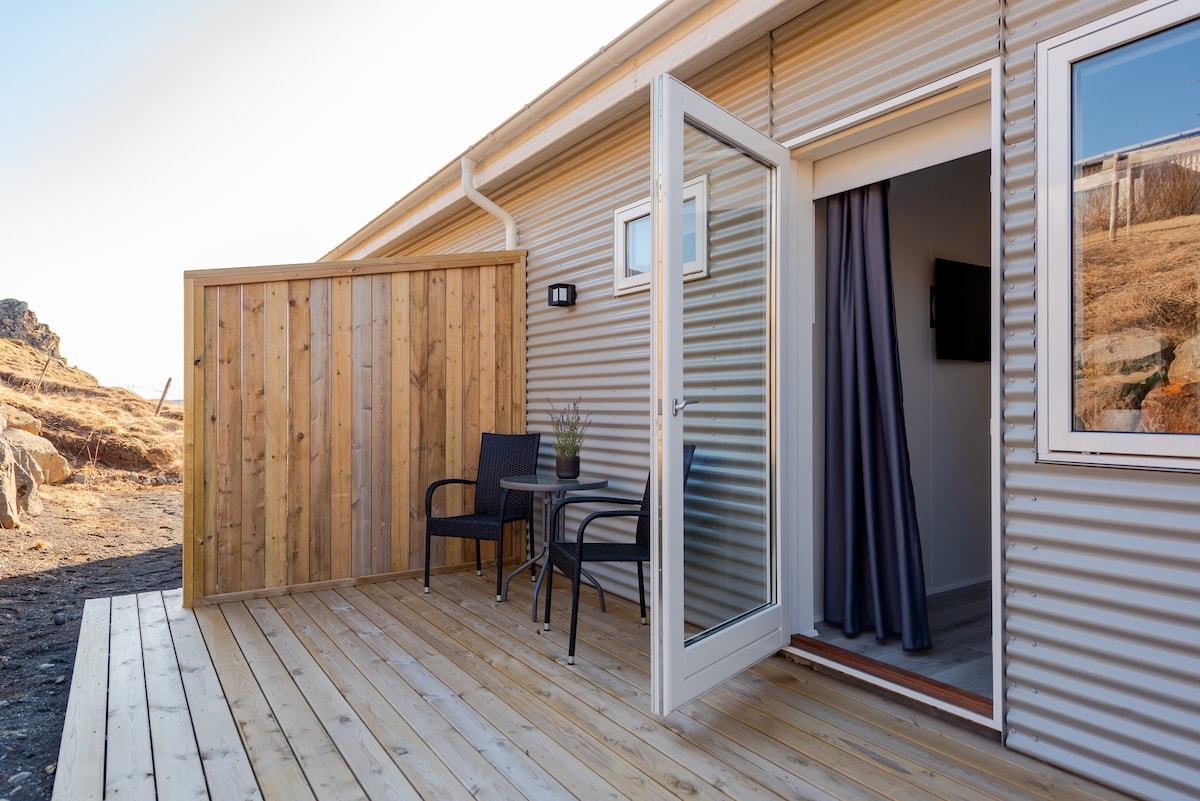 Perfect for couples! Private cabins (29fm3) by lake Apavatn. Great view of mountains as overlooking the lake. Queen bed (160cm), kitchenette with basic kitchen utilities, Nespresso machine, kettle, toaster, induction plate and a microwave. Veranda with seating area and a gas barbecue. Smart flat screen TV with Netflix. Everything is private, nature all around and space for exploring and hiking.