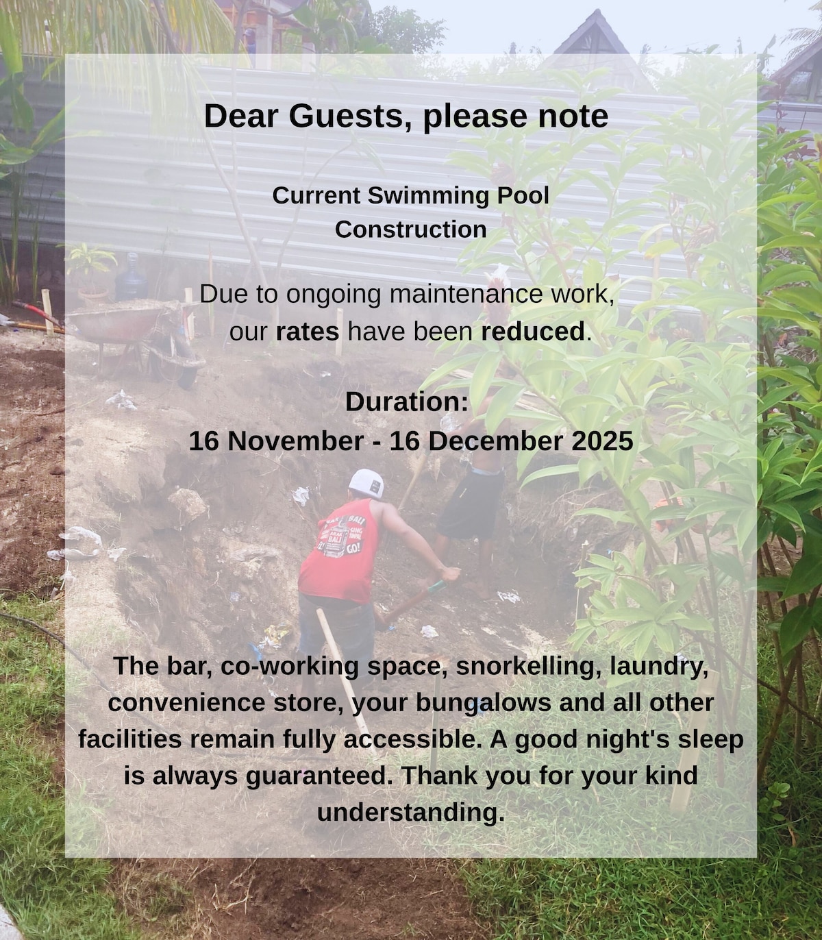 This charming bungalow 🏡 features a hot & cold tropical outdoor shower with strong water pressure & reliable air conditioning ❄️. A king-size bed & dressing table 🪞 . Fast Wi-Fi (45 Mbit/s), all-you-can-eat breakfast 🍳🥞, a cozy terrace. 50m to the co-working space, which can be transformed into an open-air cinema 🎥🍿. Relax in the hammock with views of palms & tropical garden 🌴🌺. Daily cleaning. 🧹 Fresh towels on request 🧺. Tips on 🤿 spots, cafés & sunsets 🌅. Staff always on site ℹ️