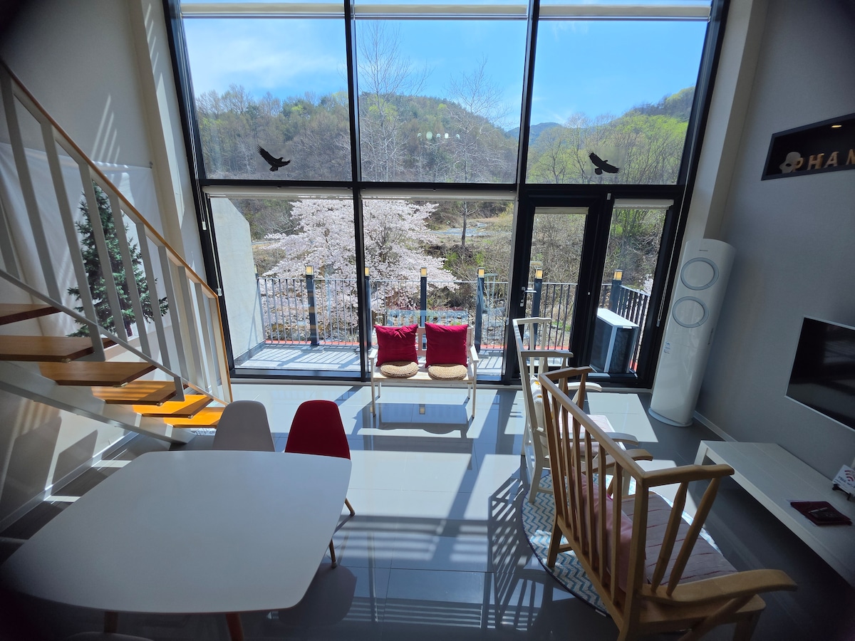 Ang tunog ng tubig ay isang log na may amoy ng kahoy at phytoncide. Ito ay isang duplex family - style na kuwarto na maingat na itinayo gamit ang mountain bin. Magandang tanawin na may magandang ulan, magandang niyebe, kumikinang na sikat ng araw ~~ Kahit na magpahinga ka mula sa Danilu, ipinagmamalaki nito ang pagiging isang kaakit - akit na kuwarto na makakalimutan ng lungsod sa isang sandali.