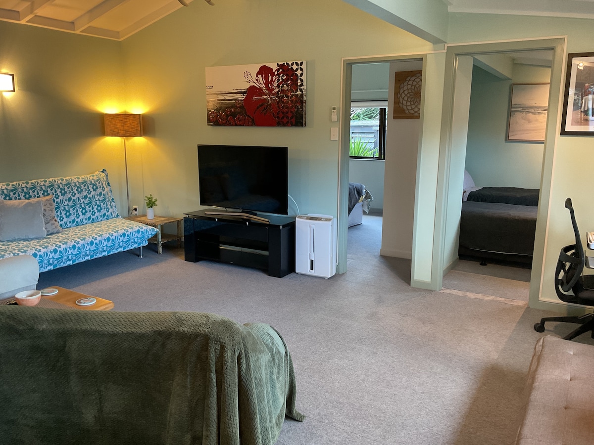 Matatagpuan ang katamtamang renovated quarters na ito na 15 minutong biyahe mula sa Gisborne City, sa Manutuke Village. Mainam para sa mag - asawa/mag - asawa o grupo ng mga kaibigan. Buong pakpak, komportable, maluwag, malinis, at maayos ang tuluyan na ito. Liblib na beach na 5 minutong biyahe o mga pangunahing beach sa lungsod. 2 minutong biyahe ang layo ng Millton winery. Gatas para sa lahat ng pangunahing pangangailangan sa pagtatapos ng drive. Pribadong deck area na may mga naglo - load ng araw, access sa pool sa tag - araw at isang maaliwalas na apoy para sa taglamig.