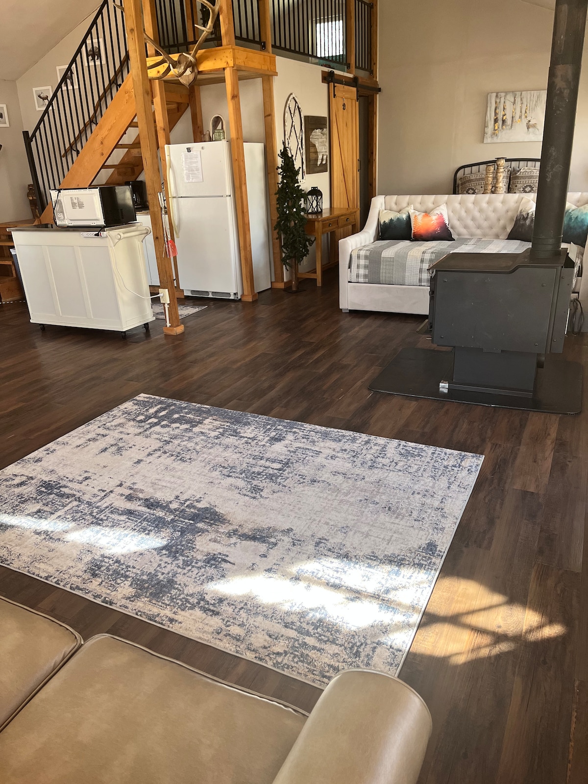 Ang 'The Duke' ay isang John Wayne na inspirasyon ng western themed space na perpekto para sa isang tahimik na bakasyon sa Ruidoso at matatagpuan sa pangunahing kalsada papunta sa bayan. Ito ang ibabang palapag ng aming pangunahing tuluyan na ginawa naming 'The Duke' kasama si John Wayne western na palamuti, komportableng sala na may mini refrigerator, microwave at kape. Huwag kalimutang silipin ang pambatang 'aparador sa ilalim ng hagdan' Harry Potter inspired closet. Mamahinga araw - araw sa 6' by 40' covered deck habang nakikinig sa ilog ng Rio Ruidoso sa ibaba